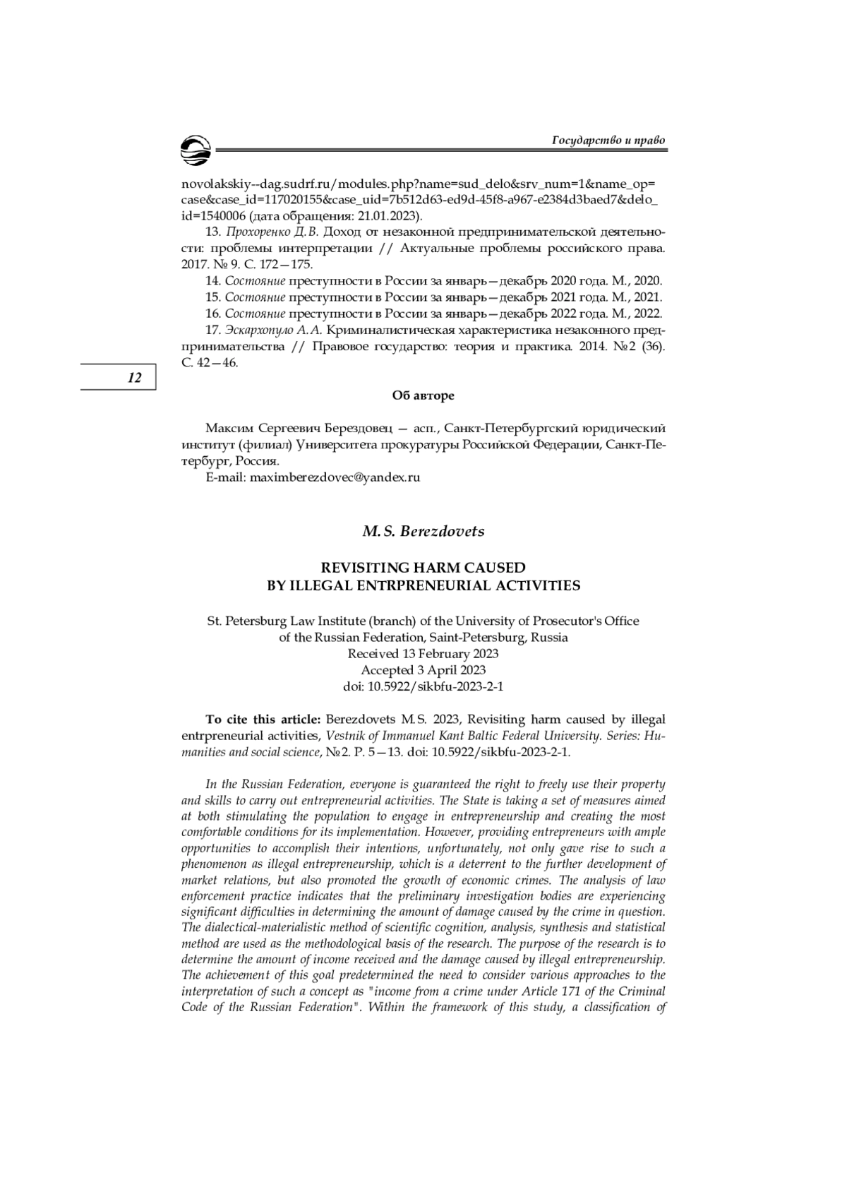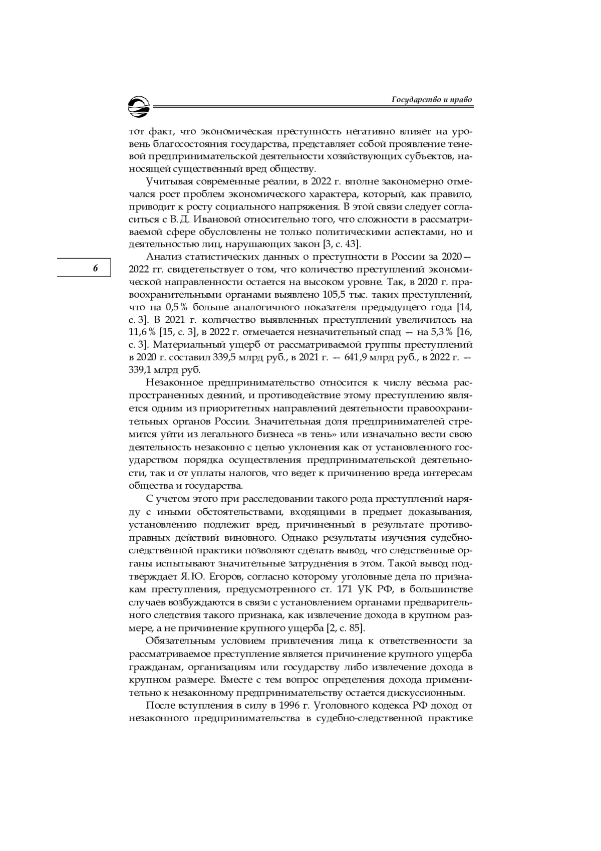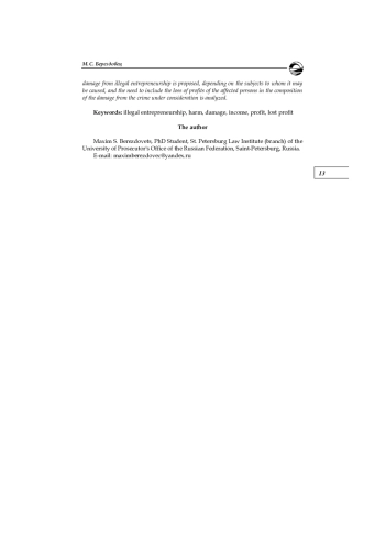2. Егоров Я. Ю. Ущерб и доход как общественные последствия незаконного предпринимательства // Гуманитарные, социально-экономические и общественные науки. 2017. № 4. С. 84-88. EDN: YMETJL