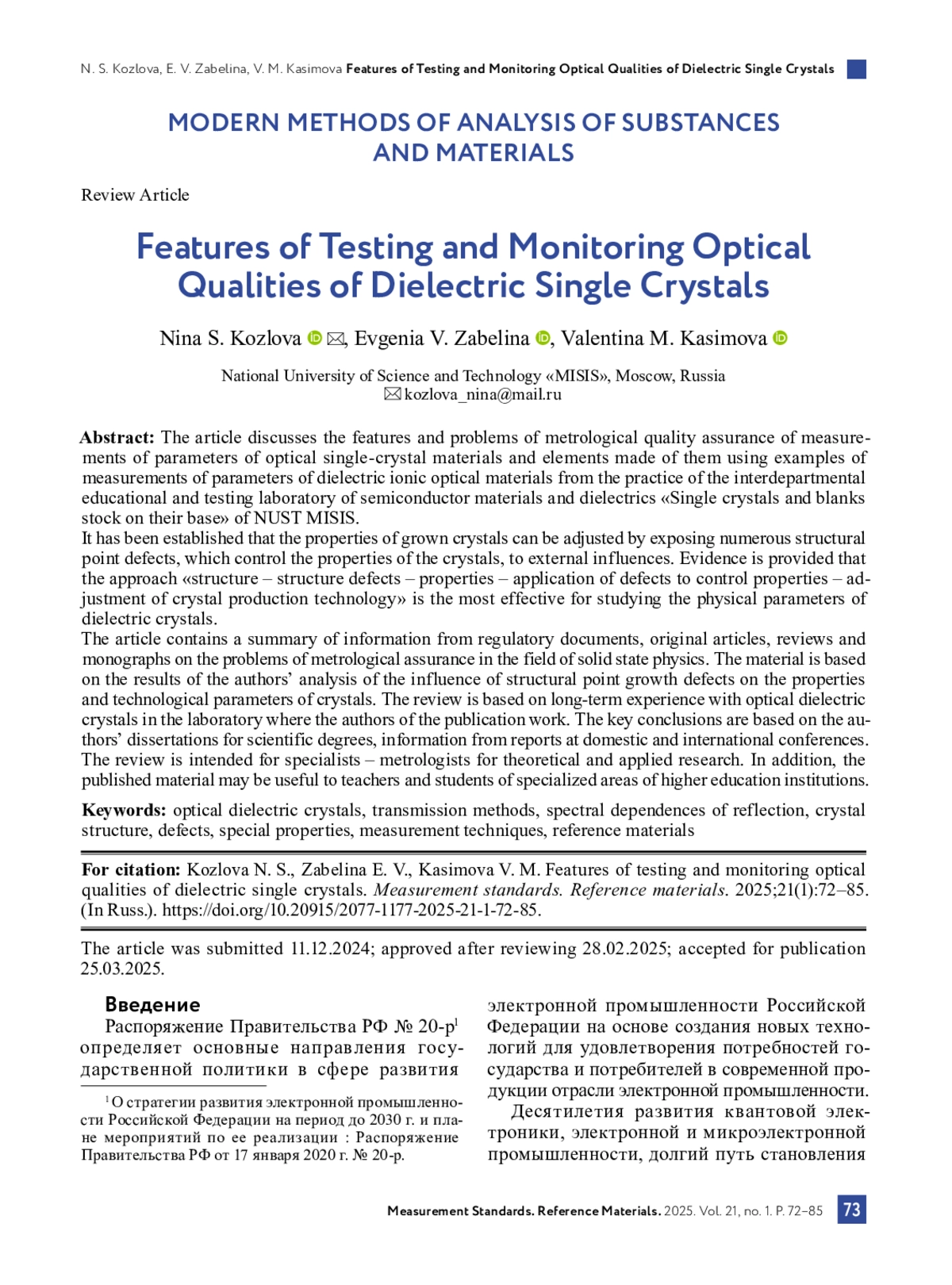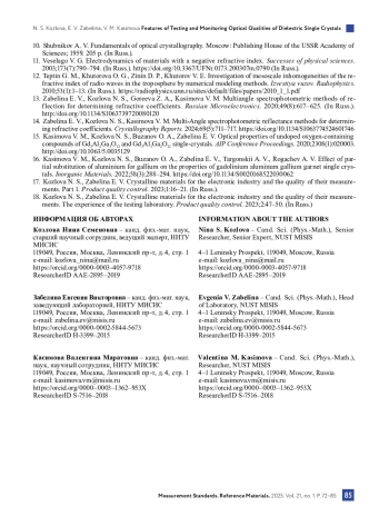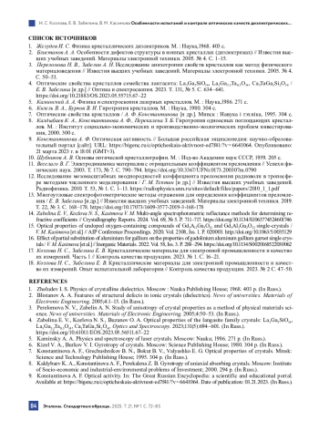 14. Zabelina E. V., Kozlova N. S., Kasimova V. M. Multi-angle spectrophotometric reflectance methods for determining refractive coefficients // Crystallography Reports. 2024. Vol. 69, № 5. Р. 711-717. DOI: 10.1134/S1063774524601746