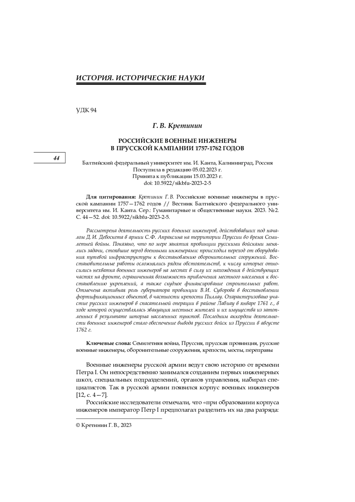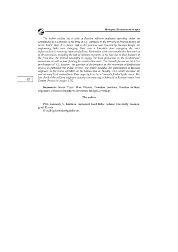 Рассмотрена деятельность русских военных инженеров, действовавших под началом Д. И. Дебоскета в армии С. Ф. Апраксина на территории Пруссии во время Семилетней войны. Показано, что по мере занятия провинции русскими войсками менялись задачи, стоявшие перед военными инженерами: происходил переход от оборудования путевой инфраструктуры к восстановлению оборонительных сооружений. Восстановительные работы осложнялись рядом обстоятельств, к числу которых относились нехватка военных инженеров на местах в силу их нахождения в действующих частях на фронте, ограниченная возможность привлечения местного населения к восстановлению укреплений, а также скудное финансирование строительных работ. Отмечена активная роль губернатора провинции В. И. Суворова в восстановлении фортификационных объектов, в частности крепости Пиллау. Охарактеризовано участие русских инженеров в спасательной операции в районе Лабиау в январе 1761 г., в ходе которой осуществлялась эвакуация местных жителей и их имущества из затопленных в результате шторма населенных пунктов. Последним аккордом деятельности военных инженеров стало обеспечение вывода русских войск из Пруссии в августе 1762 г