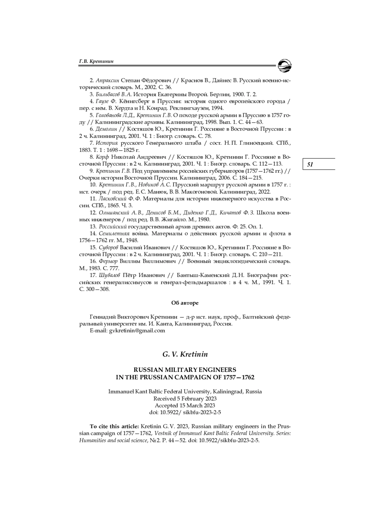 9. Кретинин Г. В. Под управлением российских губернаторов (1757-1762 гг.) // Очерки истории Восточной Пруссии. Калининград, 2006. С. 184-215.