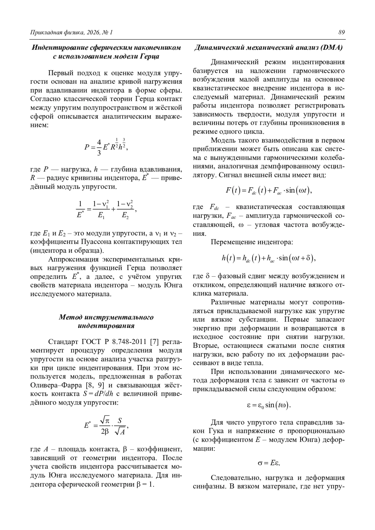 Представлены результаты сравнительного исследования различных методов определения модуля упругости Юнга наноструктурированного титана, полученного методом равноканального углового прессования с последующим волочением. Рассмотрены подходы, основанные на модели Герца, методе инструментального индентирования по Оливеру–Фарру, а также на динамическом механическом анализе (ДМА). Показано, что все методы позволяют получить согласующиеся между собой значения модуля упругости, близкие к табличным данным, при этом различия связаны с фазой процесса нагружения, учитываемой в конкретной модели. Проанализированы особенности применения сферического индентора, позволяющего восстановить диаграмму истинных напряжений–деформаций. Показано, что при малых нагрузках определяющим фактором точности являются шероховатости индентора и исследуемой поверхности, а также уровень шумов. Сделан вывод о целесообразности измерения модуля Юнга методом инструментального индентирования с последующим использованием этой величины при восстановлении полной диаграммы напряжение–деформация по данным индентирования сферическим наконечником.