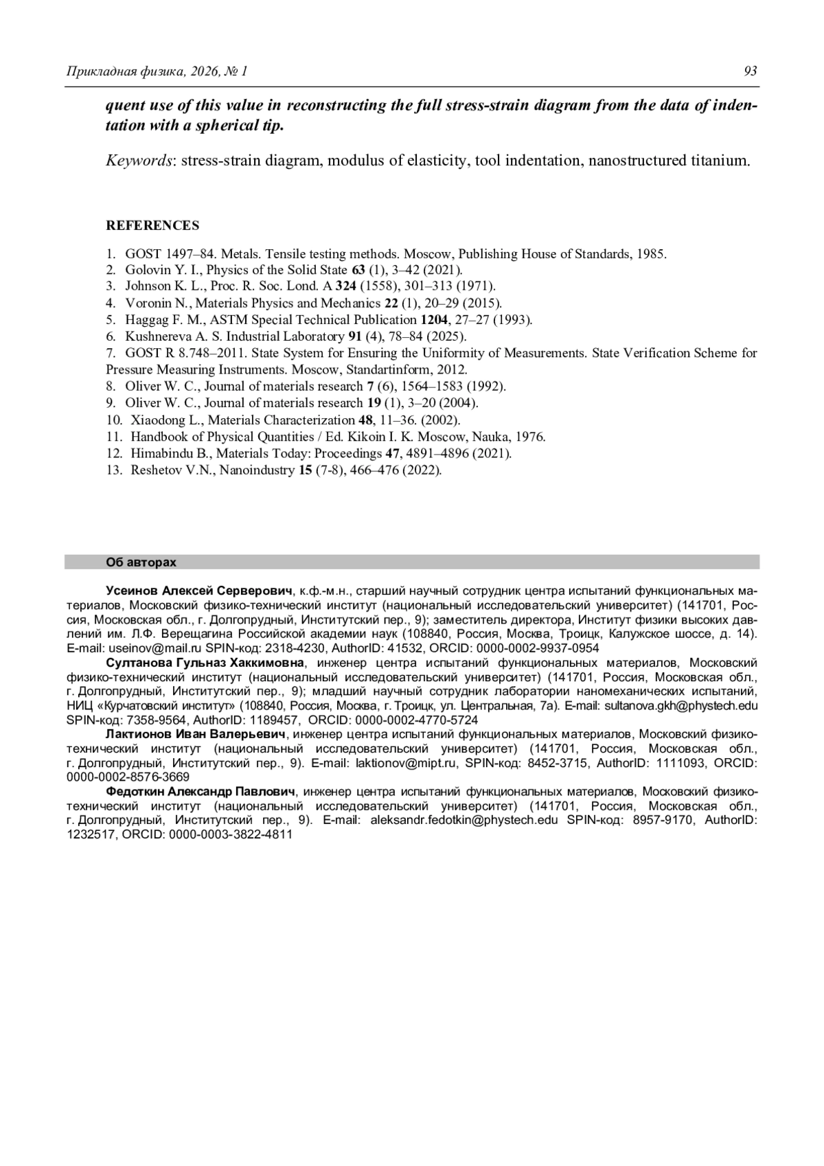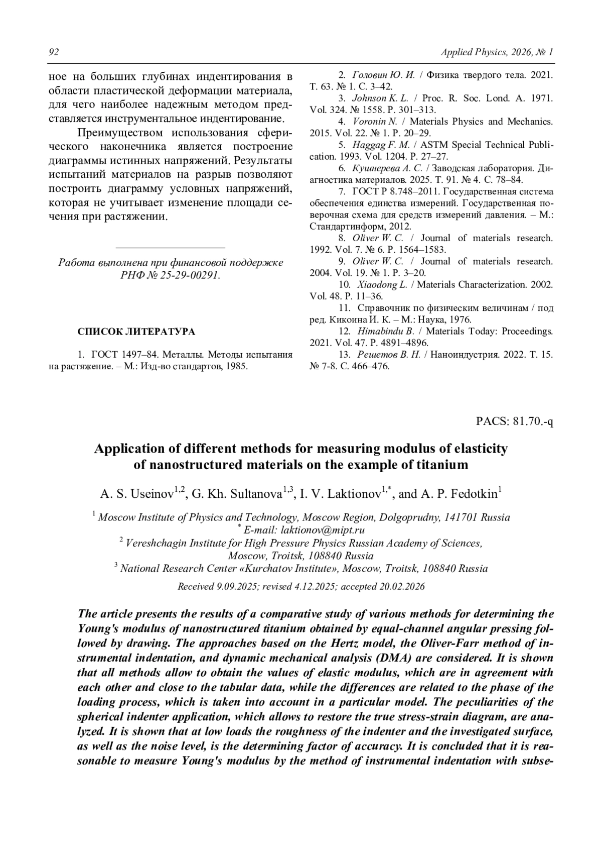 Application of different methods for measuring modulus of elasticity of nanostructured materials on the example of titanium Useinov A. S., Sultanova G. H., Laktionov I. V., and Fedotkin A. P. 87