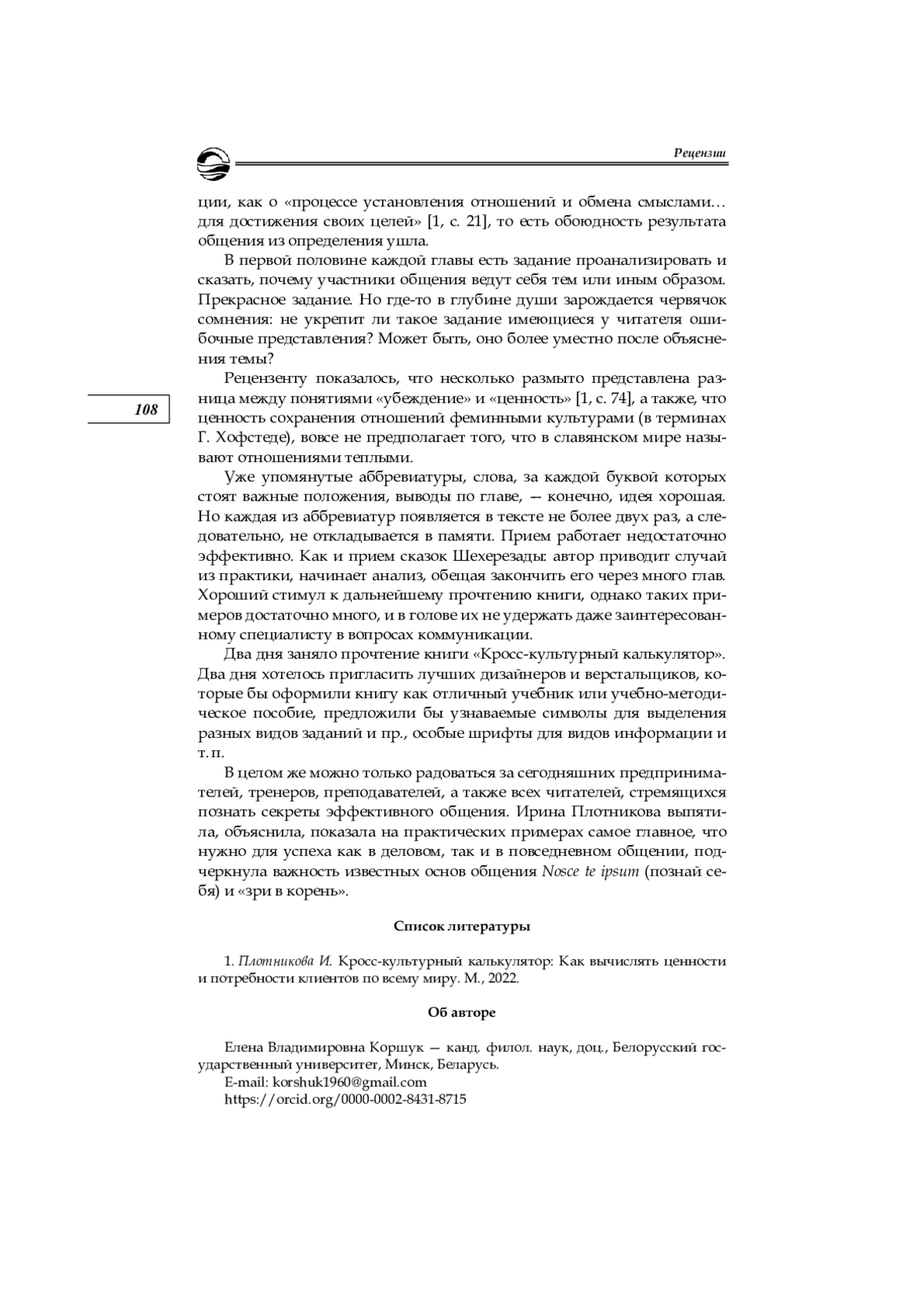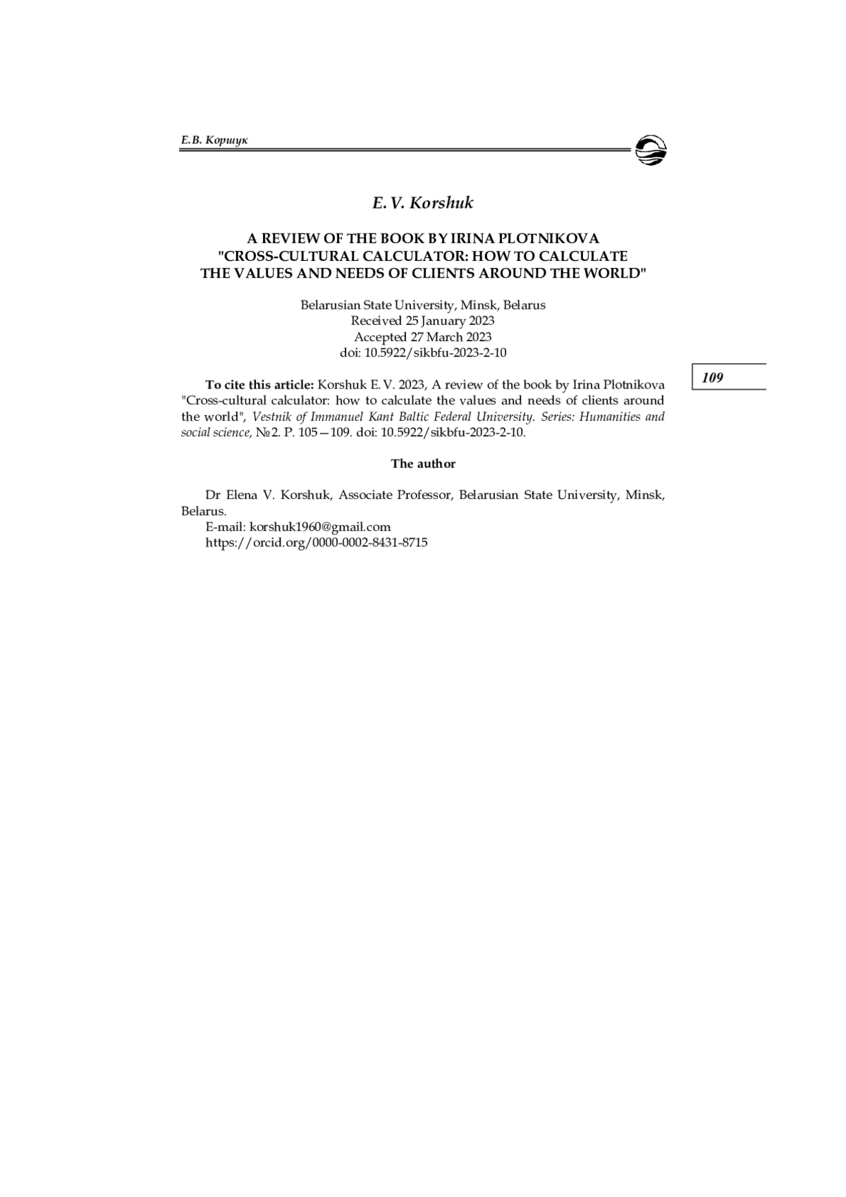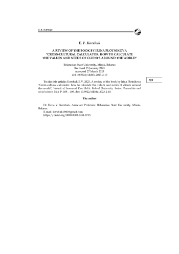 КОРШУК Е. В. РЕЦ.: ПЛОТНИКОВА И. КРОСС-КУЛЬТУРНЫЙ КАЛЬКУЛЯТОР: КАК ВЫЧИСЛЯТЬ ЦЕННОСТИ И ПОТРЕБНОСТИ КЛИЕНТОВ ПО ВСЕМУ МИРУ. М.: ИЗДАТЕЛЬСКИЕ РЕШЕНИЯ, 2022. 305 С // ВЕСТНИК БАЛТИЙСКОГО ФЕДЕРАЛЬНОГО УНИВЕРСИТЕТА ИМ. И. КАНТА. СЕРИЯ: ГУМАНИТАРНЫЕ И ОБЩЕСТВЕННЫЕ НАУКИ. 2023. № 2