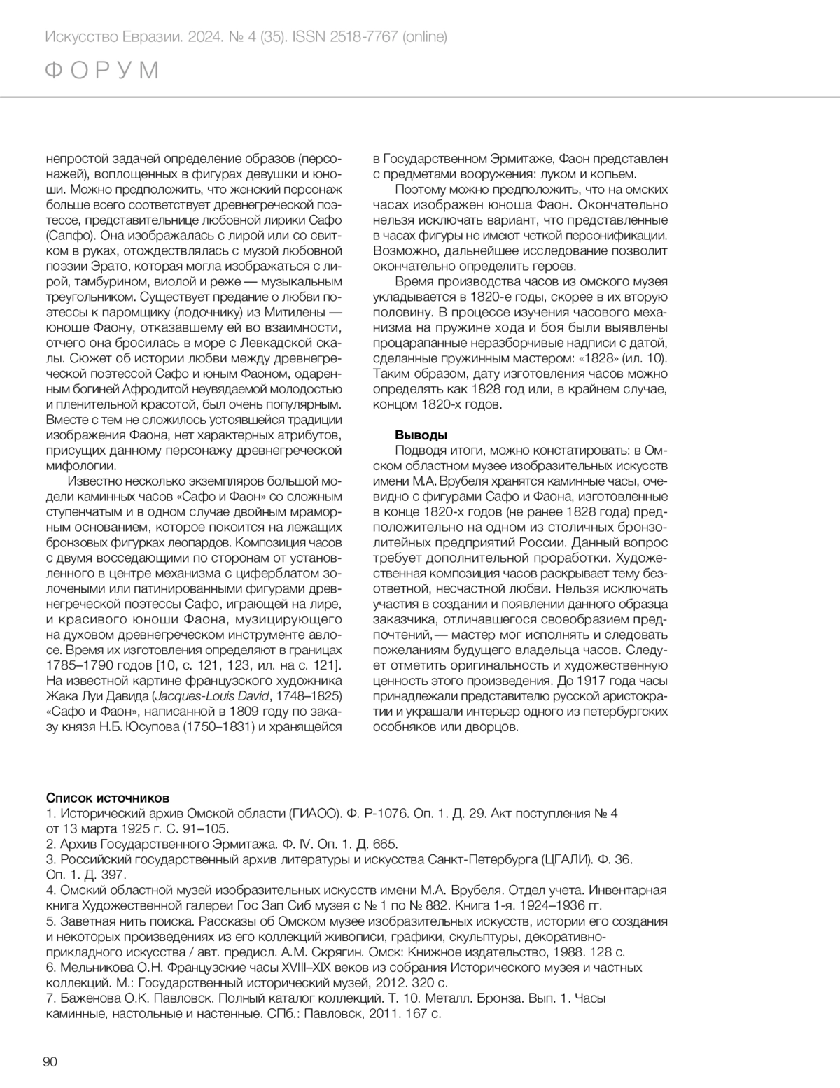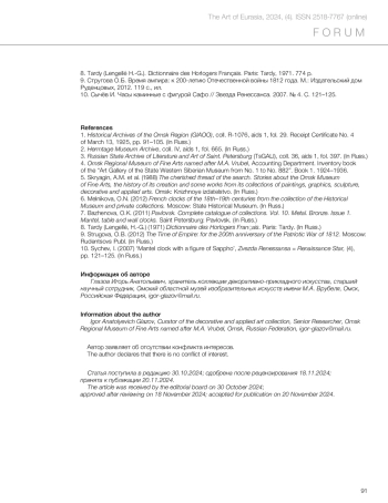 The article presents the findings of a study of bronze mantel clocks from the collection of the Omsk Regional Museum of Fine Clocks, named after M. A. Vrubel. On the basis of an artistic and stylistic analysis, the work is attributed to the field of decorative and applied art. The composition of the clock case, which depicts the theme of unrequited and unhappy love, has been subjected to detailed analysis. The subjects of the bronze reliefs decorating the pedestal and stele of the clock, as well as the bronze figures embodying the images of the ancient Greek poetess Sappho and her lover Phaon, were subjected to analysis and determined. The artistic works that inspired the composition depicted in the clock are revealed. French mantel clocks of different models with similar reliefs and figures from museum collections, private collections and those offered for sale at auctions are established. A comparative analysis of the level and quality of manufacture of the Omsk clock and similar samples permitted the conclusion that the specimen from the Siberian museum was most likely produced in Russia at one of the country’s capital cities’ bronze foundries. The study of the clock mechanism enabled the establishment of its French provenance, while the inscription on the movement and strike spring facilitated the clarification of the dating: the mechanism was manufactured in 1828, with the clock itself dating to the late 1820s (and therefore not earlier than 1828). The examination of archival materials has not yet yielded sufficient evidence to ascertain the ownership of the object. However, the available evidence suggests that this sophisticated and esteemed bronze ornament was a prominent feature of the interior of a Saint Petersburg mansion or palace belonging to the Russian aristocracy until 1917.