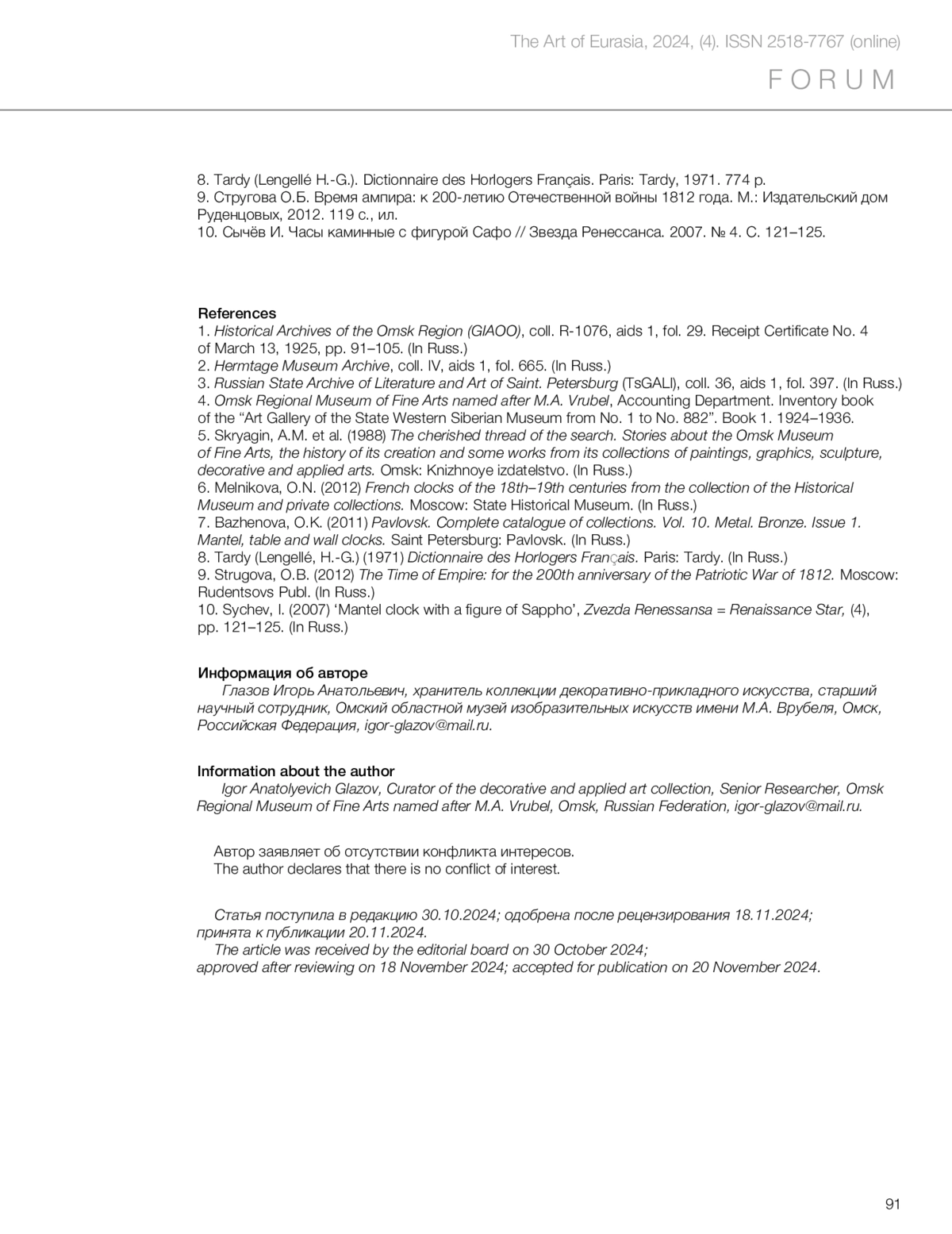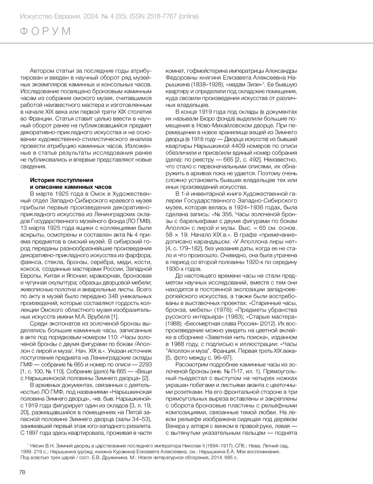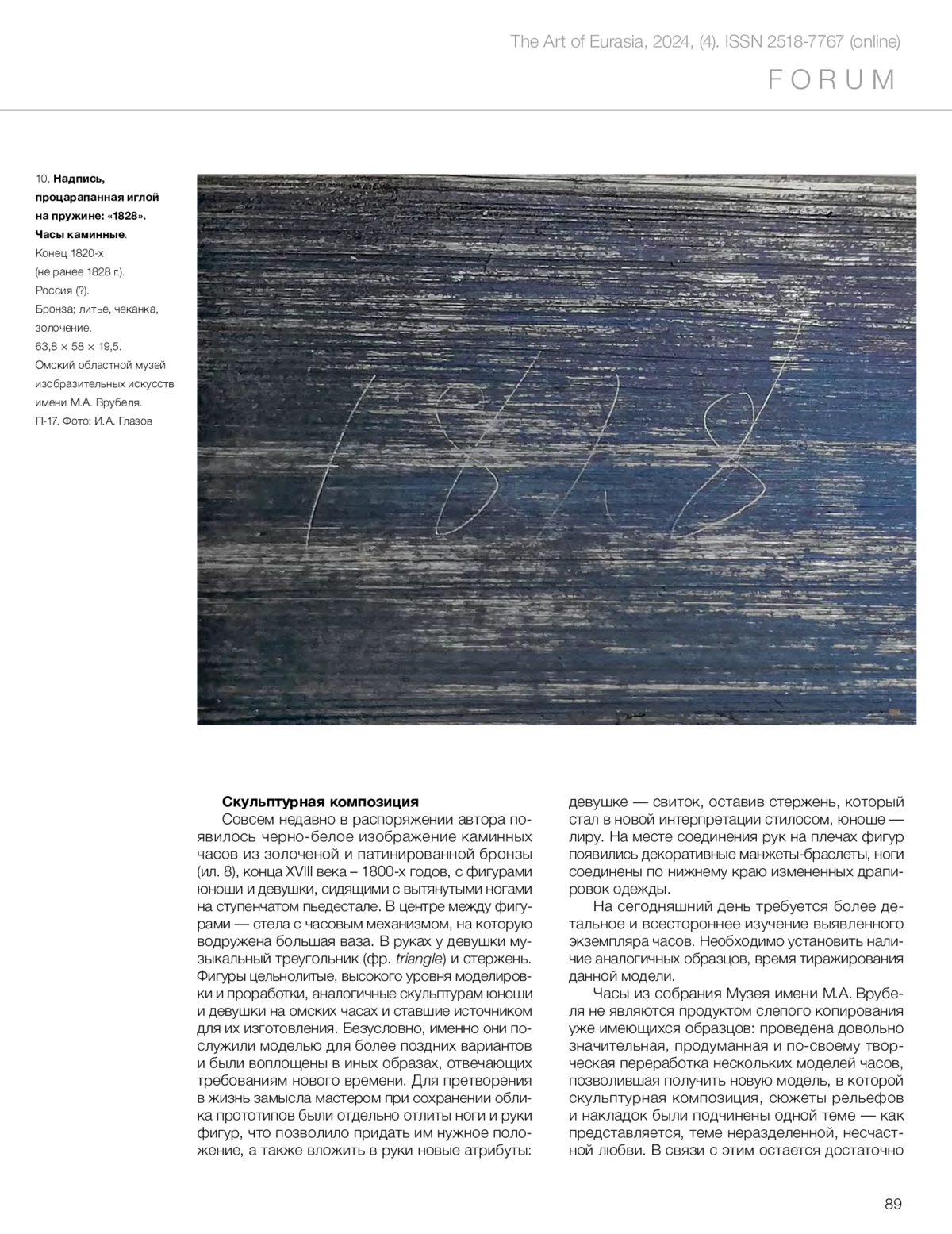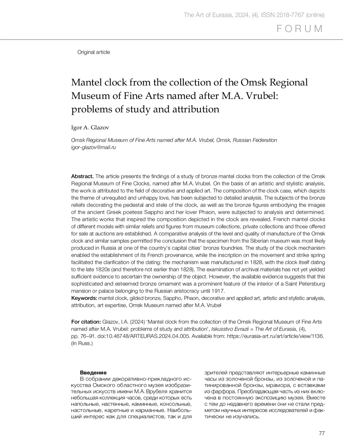 Глазов И.А. Каминные часы из собрания Омского областного музея изобразительных искусств имени М.А. Врубеля: проблемы изучения и атрибуции // Искусство Евразии [Электронный журнал]. 2024. No 4 (35). С. 76–91. https://doi.org/10.46748/ARTEURAS.2024.04.005.