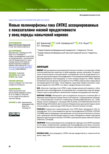Исследования генетических основ фенотипического полиморфизма признаков, определяющих мясную продуктивность, ведутся уже многие десятилетия. Известно, что большинство показателей продуктивности находится под совместным контролем значительного числа генов [1]. С развитием высокопроизводительных технологий генотипирования по однонуклеотидным полиморфизмам Single Nucleotide Polymorphism (SNP) широко применяются полногеномные ассоциативные исследования Genome-Wide Association Study (GWAS) для обнаружения новых генов-кандидатов количественных признаков у различных видов животных, что дает больше идей по повышению эффективности разведения и селекции [2]. Гены с определенным потенциалом, такие как VRTN, NR6A1, MSTN, ADIPOQ, LCORL, MEF2B, FASN, FABP4, SCD, DGAT1, BMP и HOX, демонстрируют значительную связь с экономически ценными характеристиками для повышения эффективности разведения и увеличения производства баранины во всем мире [3]. Актуальная задача для современных селекционеров – повышение мясной продуктивности овец отечественных мериносовых пород. Порода манычский меринос перспективна в исследовании ввиду отличительной ценности шерстяной и мясной продуктивности, поэтому ее изучение с помощью современных геномных технологий позволяет повысить рентабельность овцеводства за счет конкурентоспособных продуктов. Однако, несмотря на успехи в идентификации множества генетических маркеров у сельскохозяйственных животных, ключевой проблемой остается функциональная интерпретация выявленных ассоциаций.