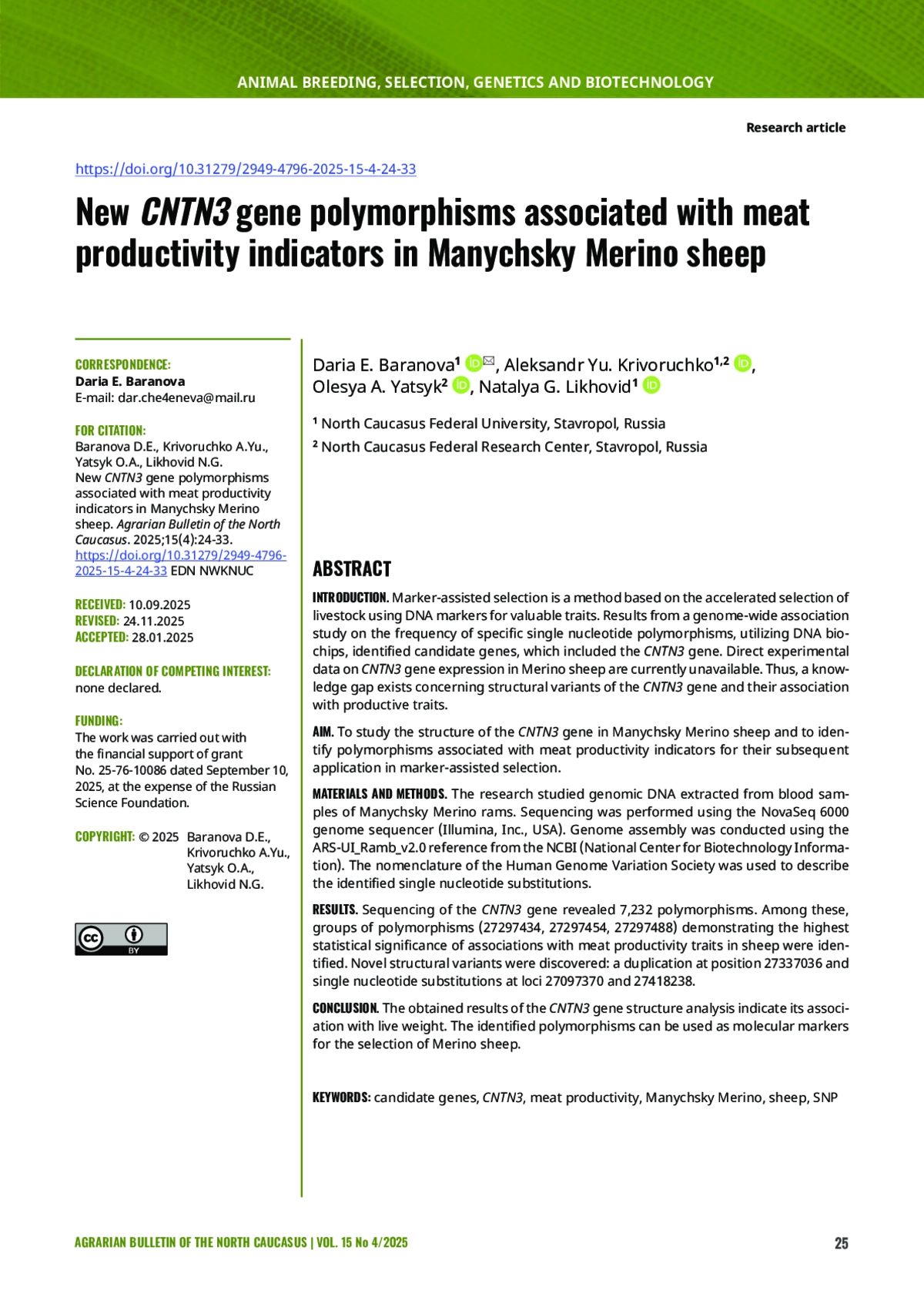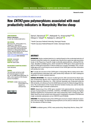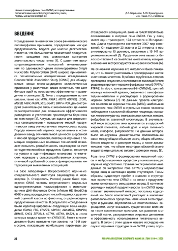 ВВЕДЕНИЕ. Метод маркер-ассоциированной селекции основан на ускоренном отборе сельскохозяйственных животных по ДНК-маркерам ценных признаков. По результатам полногеномного ассоциативного исследования частоты встречаемости отдельных однонуклеотидных полиморфизмов с использованием ДНК-биочипов были идентифицированы гены-кандидаты, в число которых входил ген CNTN3. Прямые экспериментальные данные об экспрессии гена CNTN3 у мериносовых пород овец в настоящее время отсутствуют. Таким образом, существует пробел в знаниях о структурных вариантах гена CNTN3 и их связи с продуктивными качествами.