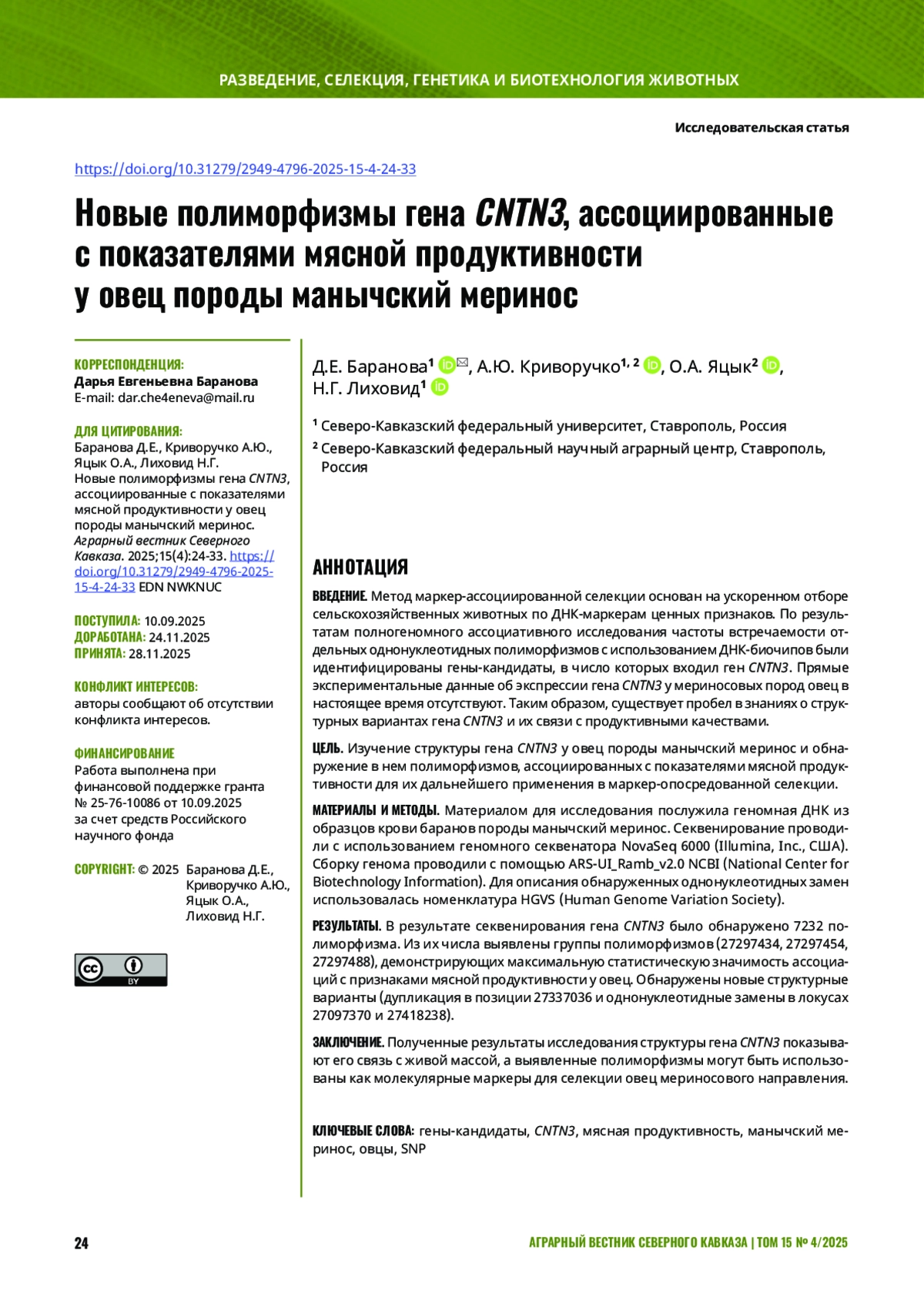 МАТЕРИАЛЫ И МЕТОДЫ. Материалом для исследования послужила геномная ДНК из образцов крови баранов породы манычский меринос. Секвенирование проводили с использованием геномного секвенатора NovaSeq 6000 (Illumina, Inc., США). Сборку генома проводили с помощью ARS-UI_Ramb_v2.0 NCBI (National Center for Biotechnology Information). Для описания обнаруженных однонуклеотидных замен использовалась номенклатура HGVS (Human Genome Variation Society).