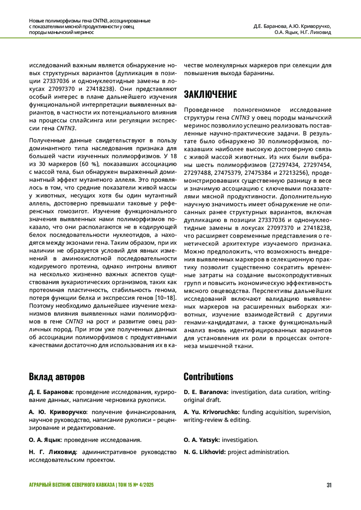 ЗАКЛЮЧЕНИЕ. Полученные результаты исследования структуры гена CNTN3 показывают его связь с живой массой, а выявленные полиморфизмы могут быть использованы как молекулярные маркеры для селекции овец мериносового направления.