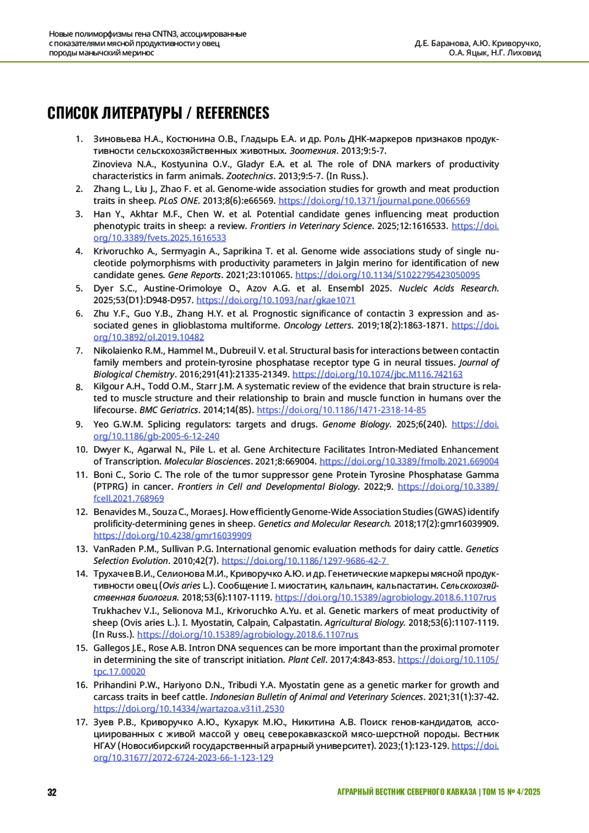 3. Han Y., Akhtar M.F., Chen W., et al. Potential candidate genes influencing meat production phenotypic traits in sheep: a review. Frontiers in Veterinary Science. 2025;12:1616533. DOI: 10.3389/fvets.2025.1616533