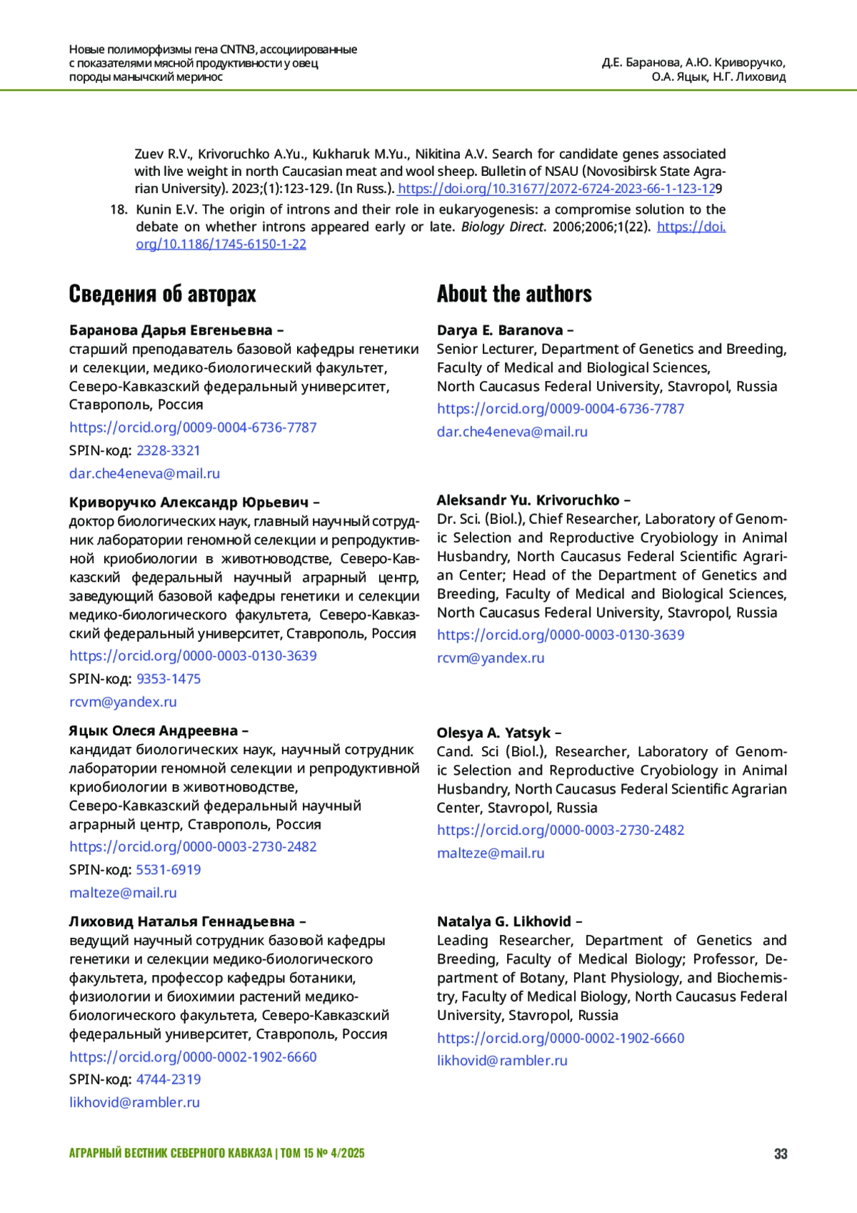 4. Krivoruchko A., Sermyagin A., Saprikina T. et al. Genome wide associations study of single nucleotide polymorphisms with productivity parameters in Jalgin merino for identification of new candidate genes. Gene Reports. 2021;23:101065. DOI: 10.1134/S1022795423050095