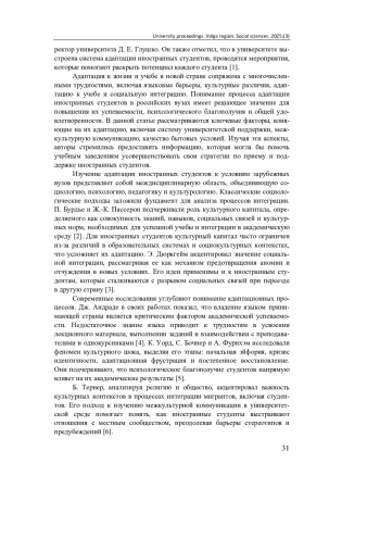18. Айбазова М. Ю. Социокультурная адаптация иностранных студентов к условиям обучения в российских вузах // Вестник Омского государственного педагогического университета. Гуманитарные исследования. 2022. № 1 (34). С. 117-121. DOI: 10.36809/2309-9380-2022-34-117-121 EDN: GWXLIP