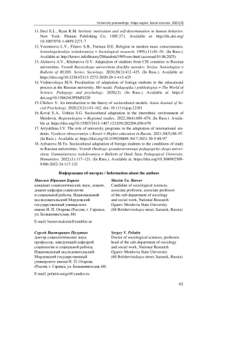13. Акимова А. В., Хабарова О. В. Адаптация студентов из стран СНГ в российских вузах // Вестник Российского университета дружбы народов. Серия: Социология. 2020. Т. 20, № 3. С. 412-425. DOI: 10.22363/2313-2272-2020-20-3-412-425