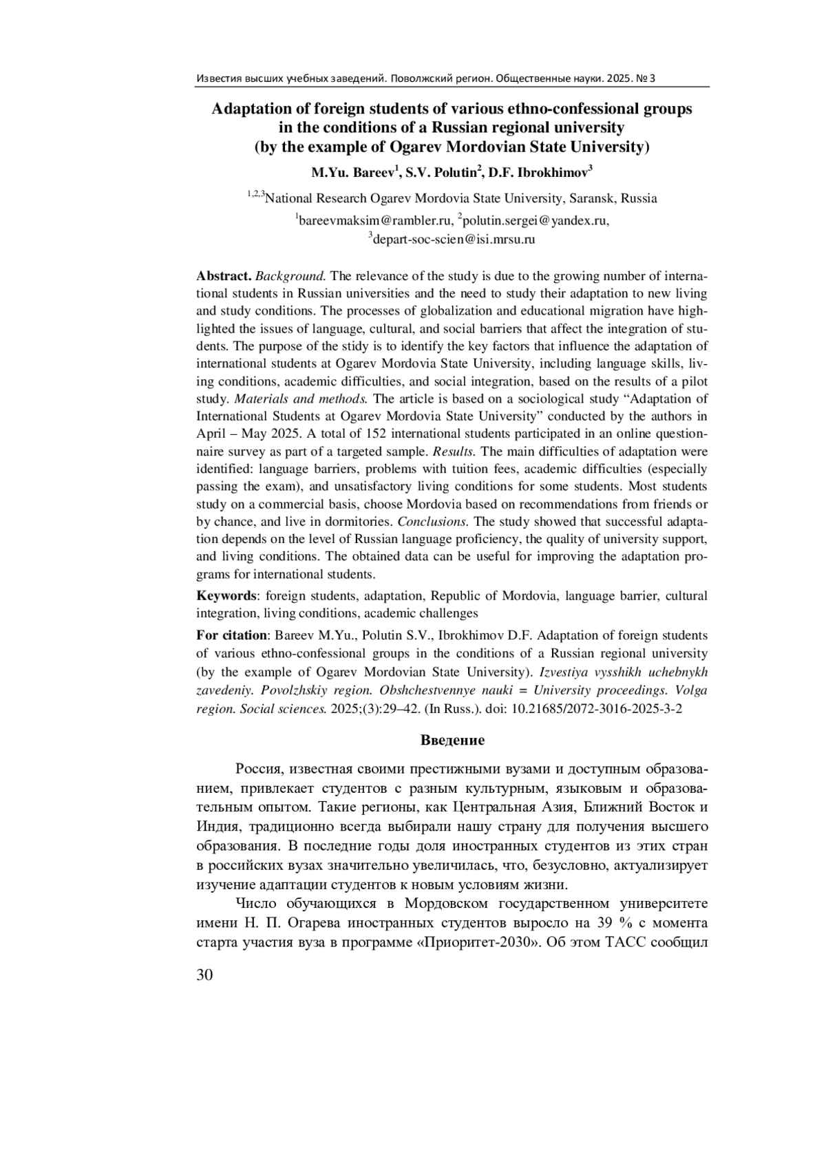 Актуальность и цели. Актуальность исследования обусловлена ростом числа иностранных студентов в российских вузах и необходимостью изучения их адаптации к новым условиям жизни и учебы. Процессы глобализации и образовательной миграции актуализируют вопросы языковых, культурных и социальных барьеров, влияющих на интеграцию студентов. Цель работы - по результатам исследования выявить ключевые факторы, влияющие на адаптацию иностранных студентов в Мордовском государственном университете имени Н. П. Огарева (Республика Мордовия), включая языковые навыки, бытовые условия, академические трудности и социальную интеграцию.