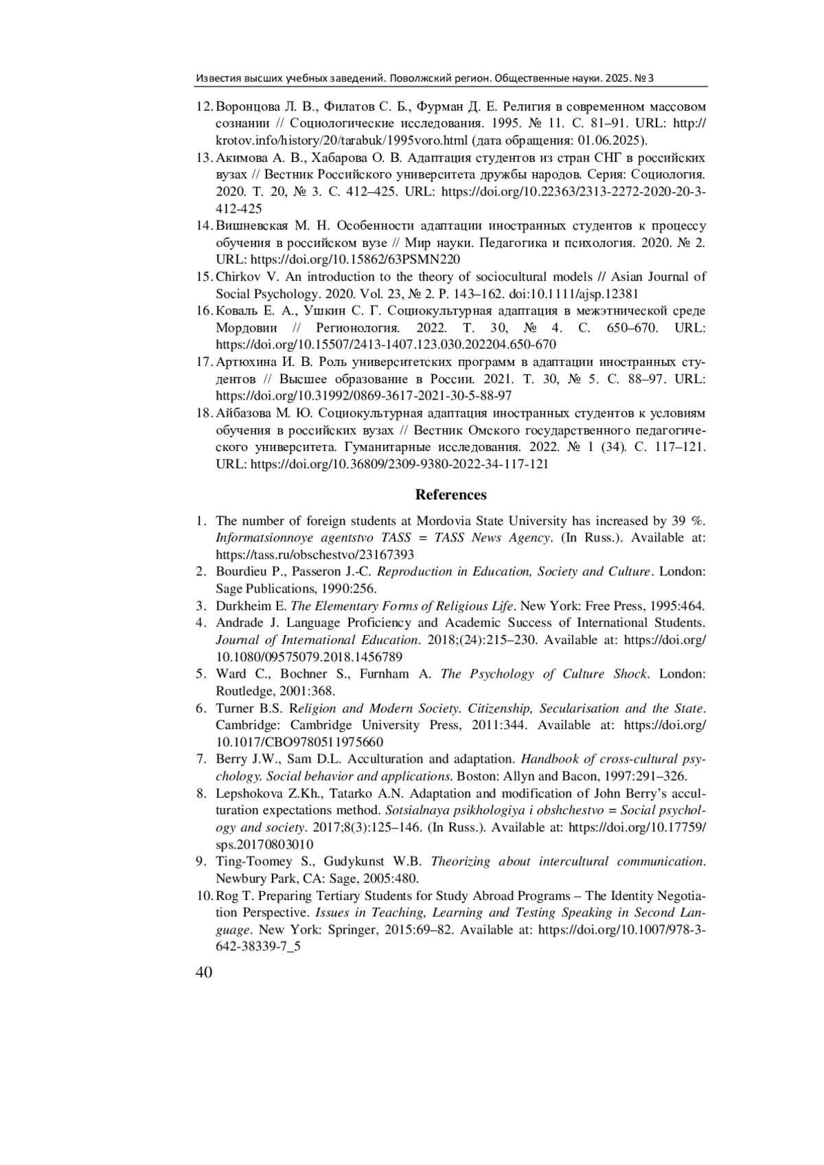 17. Артюхина И. В. Роль университетских программ в адаптации иностранных студентов // Высшее образование в России. 2021. Т. 30, № 5. С. 88-97. DOI: 10.31992/0869-3617-2021-30-5-88-97