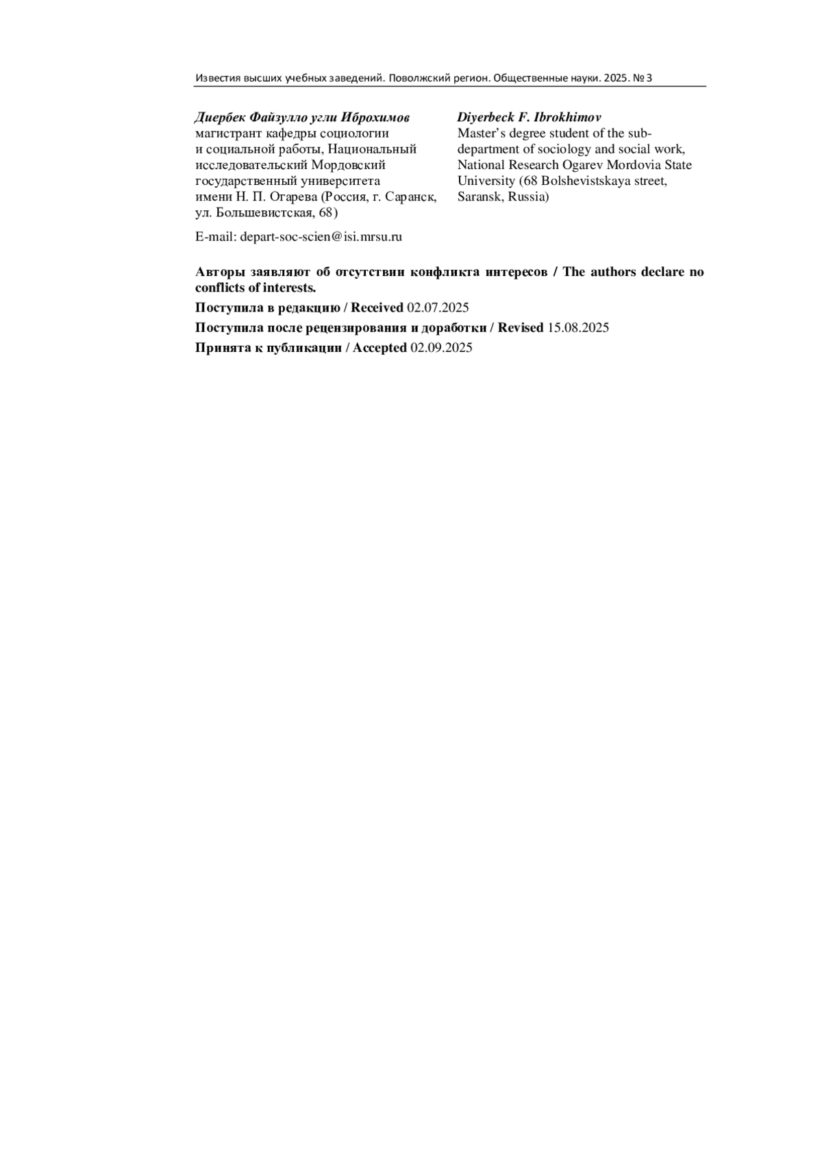 Материалы и методы. В качестве метода социологического исследования использовался количественный метод (массовый анкетный опрос, июнь - июль 2025, n = 503 в Пензенском регионе, Татарстане, республиках Башкортостан и Дагестан).