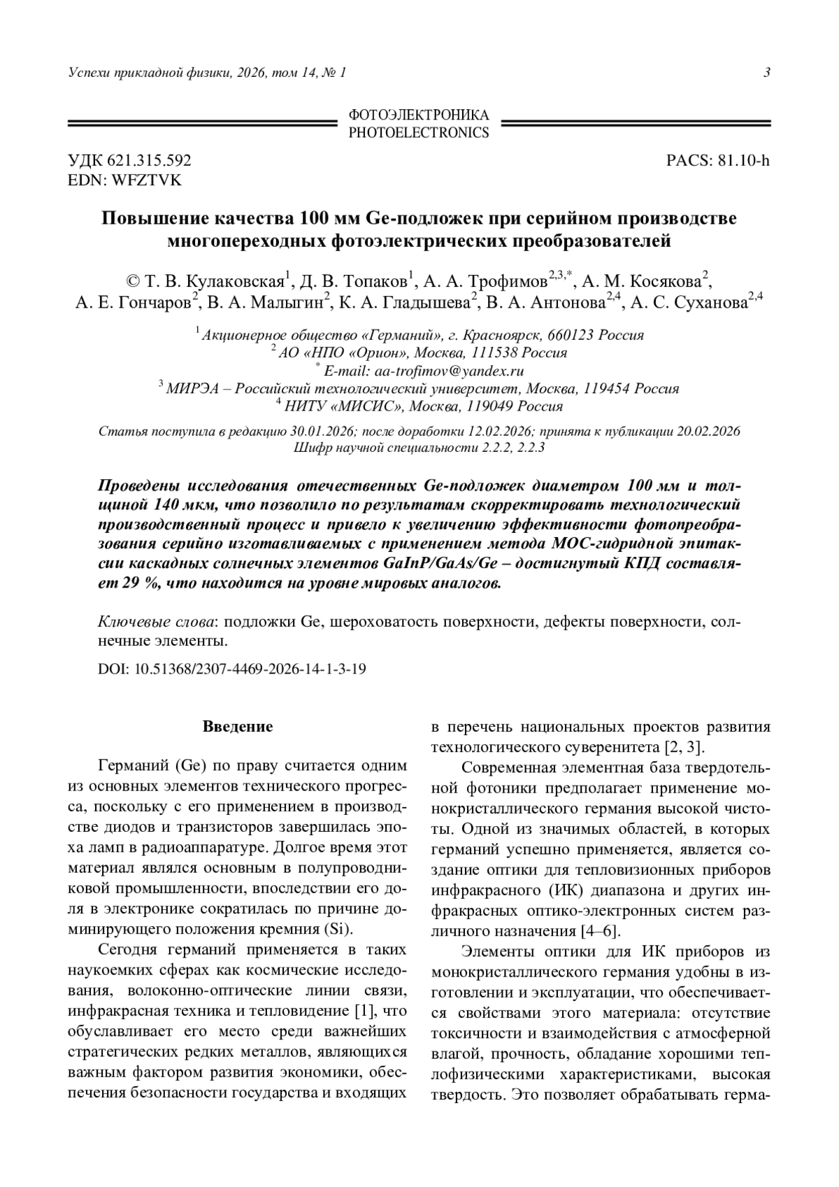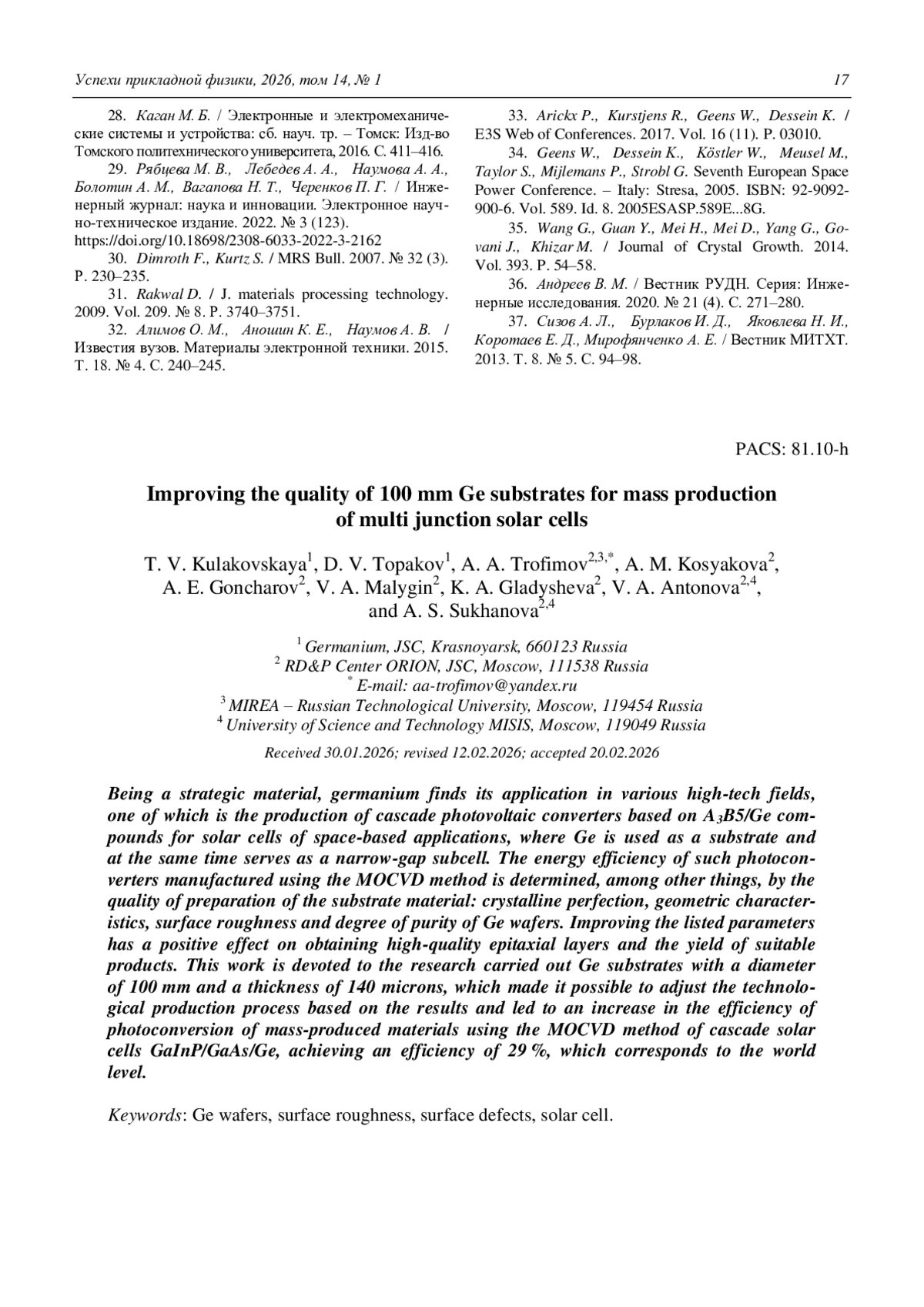 Improving the quality of 100 mm Ge substrates for mass production of multi junction solar cells Kulakovskaya T. V., Topakov D. V., Trofimov A. A., Kosyakova A. M., Goncharov A. E., Malygin V. A., Gladysheva K. A., Antonova V. A., and Sukhanova A. S. 3