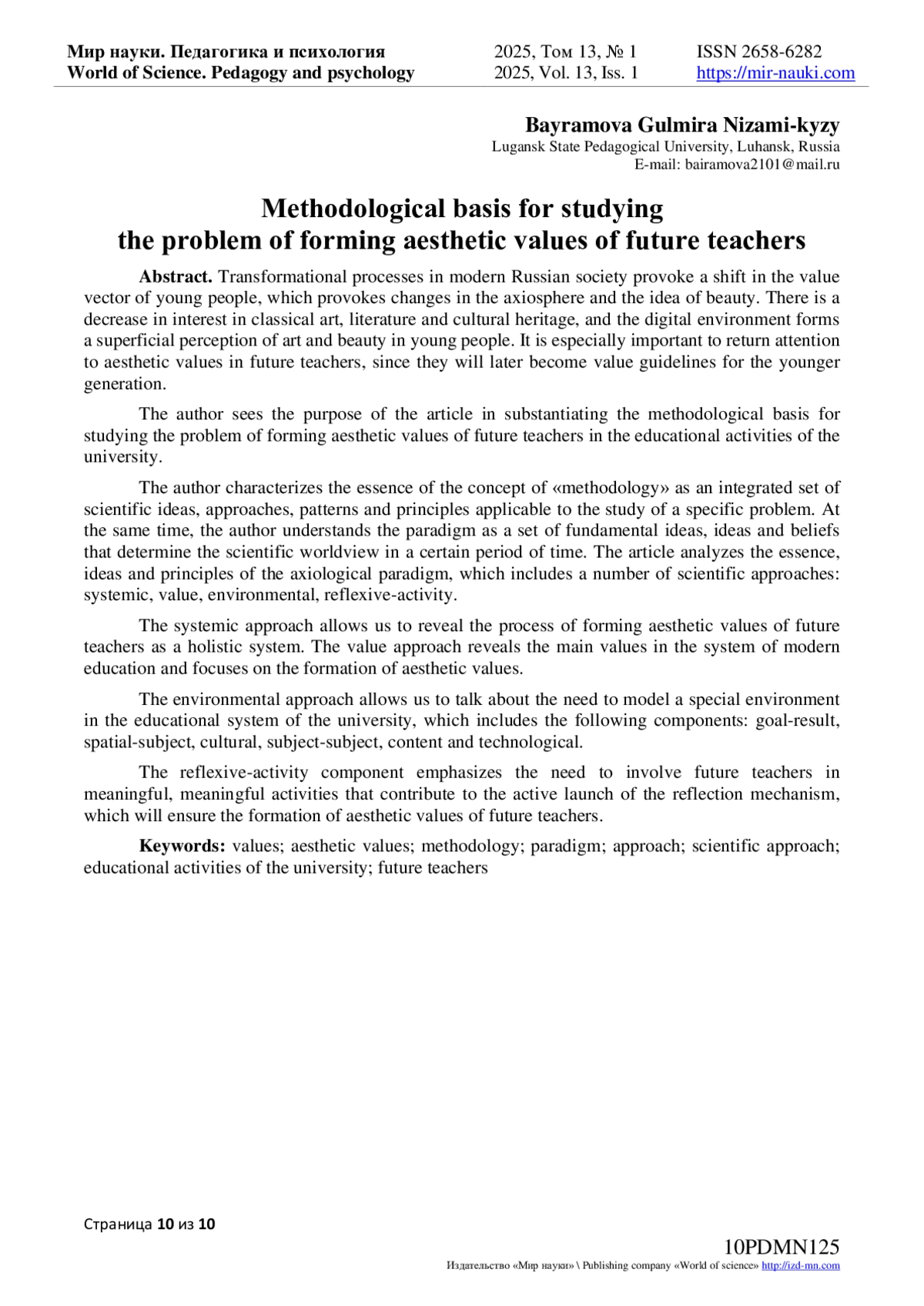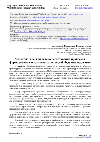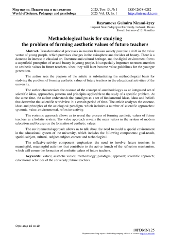Цель статьи автор видит в обосновании методологической основы исследования проблемы формирования эстетических ценностей будущих педагогов в воспитательной деятельности университета. Автор характеризует сущность понятия «методология» как интегрированную совокупность научных идей, подходов, закономерностей и принципов, применимых к исследованию конкретной проблемы. В то же время, парадигму автор понимает как совокупность фундаментальных идей, представлений и убеждений, определяющих научное мировоззрение в определенный период времени. В рамках статьи анализируются сущность, идеи и принципы аксиологической парадигмы, которая вмещает в себя ряд научных подходов: системный, ценностный, средовой, рефлексивно-деятельностный. Системный подход позволяет раскрыть процесс формирования эстетических ценностей будущих педагогов как целостную систему. Ценностный раскрывает основные ценности в системе современного образования и ориентирует на формирование эстетических ценностей. Средовой подход позволяет говорить о необходимости моделирования специально среды в воспитательной системе университета, которая вмещает такие компоненты: целе-результативный, пространственно-предметный, культурный, субъект-субъектный, содержательный и технологический. Рефлексивно-деятельностный компонент подчеркивает необходимость вовлечения будущих педагогов в значимую, смысловую деятельность, способствующую активному запуску механизма рефлексии, что обеспечит формирование эстетических ценностей будущих педагогов.