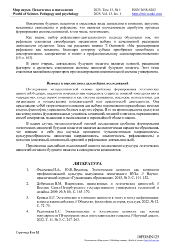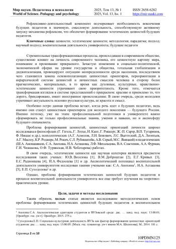 Трансформационные процессы в современном российском обществе провоцируют смещение ценностного вектора молодежи, что провоцирует изменения в аксиосфере и представлении о прекрасном. Наблюдается снижение интереса к классическому искусству, литературе и культурному наследию, а цифровая среда формирует у молодежи поверхностное восприятие искусства и прекрасного. Особенно важно вернуть внимание к эстетическим ценностям у будущих педагогов, поскольку именно они в дальнейшем станут ценностными ориентирами для подрастающего поколения.