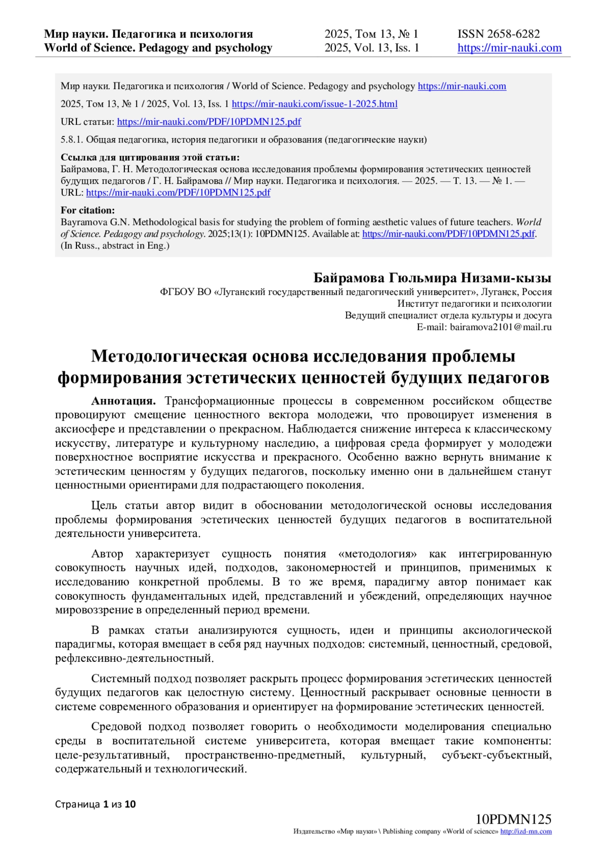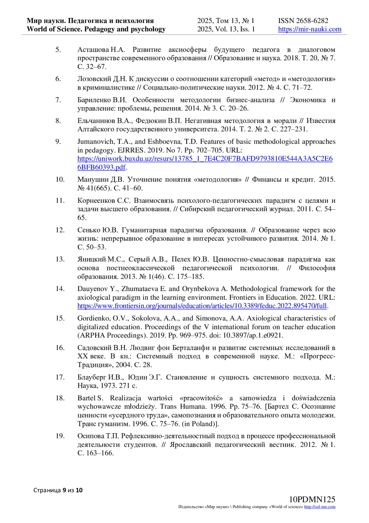 14. Dauyenov Y., Zhumataeva E. and Orynbekova A. Methodological framework for the axiological paradigm in the learning environment. Frontiers in Education. 2022. URL: https://www.frontiersin.org/journals/education/articles//full. DOI: 10.3389/feduc.2022.895470
