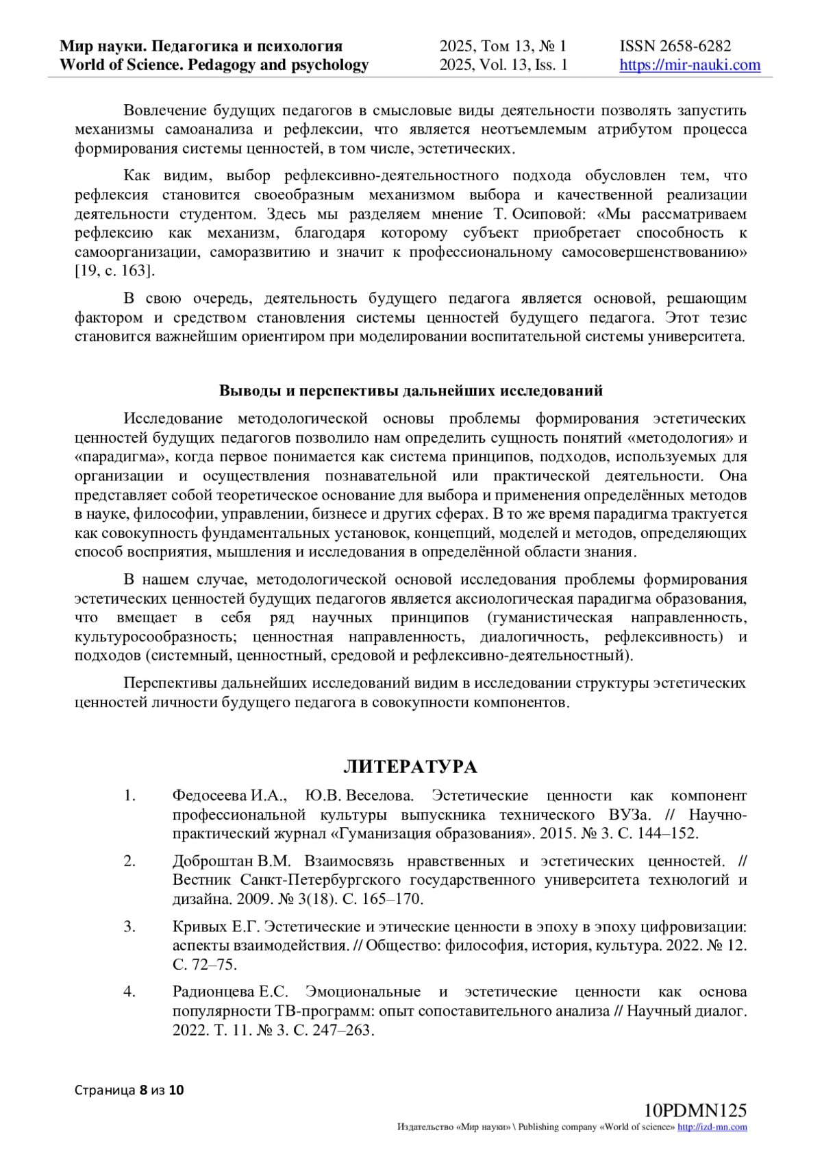 1. Федосеева И.А., Ю.В. Веселова. Эстетические ценности как компонент профессиональной культуры выпускника технического ВУЗа. // Научно-практический журнал “Гуманизация образования”. 2015. № 3. С. 144-152. EDN: UFENXJ