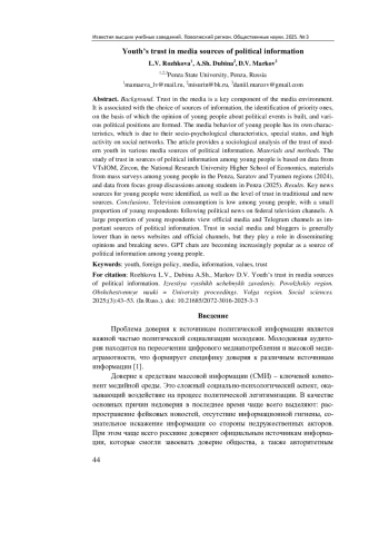 Проблема доверия к источникам политической информации является важной частью политической социализации молодежи. Молодежная аудитория находится на пересечении цифрового медиапотребления и высокой медиаграмотности, что формирует специфику доверия к различным источникам информации [1].