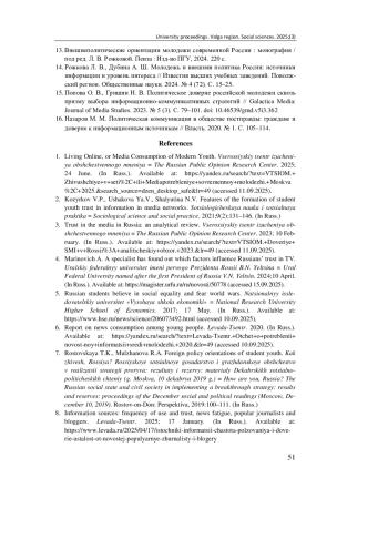 2. Козырьков В. П., Ушакова Я. В., Шалютина Н. В. Особенности формирования доверия учащейся молодежи к информации в медиасетях // Социологическая наука и социальная практика. 2021. Т. 9, № 2. С. 131-146. EDN: OCLWYM
