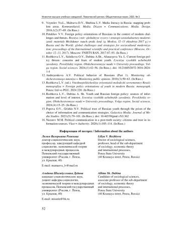 14. Рожкова Л. В., Дубина А. Ш. Молодежь и внешняя политика России: источники информации и уровень интереса // Известия высших учебных заведений. Поволжский регион. Общественные науки. 2024. № 4 (72). С. 15-25. EDN: UWEBTM