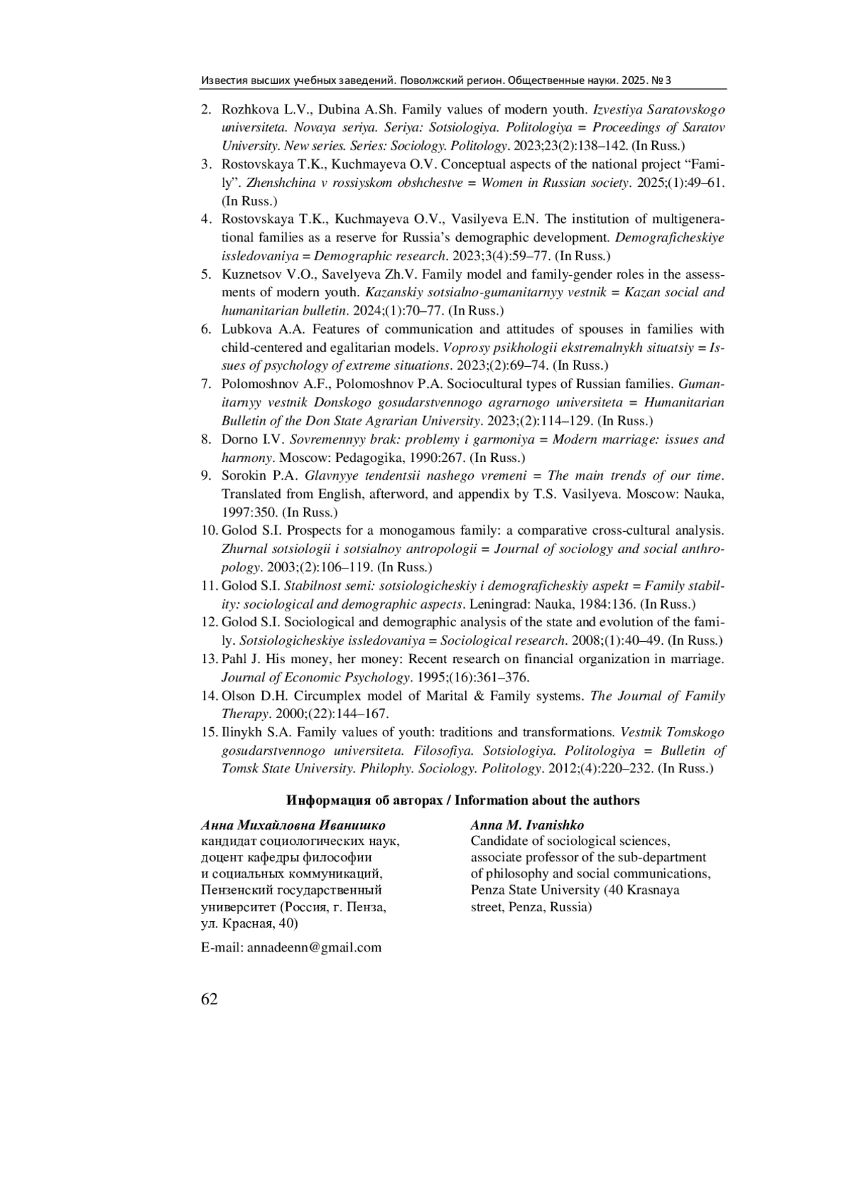 2. Рожкова Л. В., Дубина А. Ш. Семейные ценности современной молодежи // Известия Саратовского университета. Новая серия. Серия: Социология. Политология. 2023. Т. 23, № 2. С. 138-142. EDN: JEVTPY