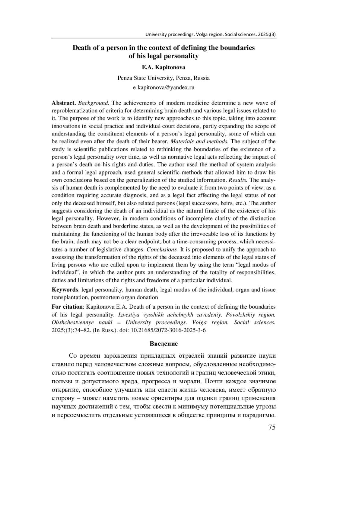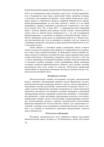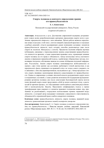 Материалы и методы. Предметом изучения избраны научные публикации, связанные с переосмыслением границ существования правосубъектности личности во времени, а также нормативно-правовые акты, отражающие влияние смерти человека на его права и обязанности. Автор использовал метод системного анализа и формально-юридический подход, задействовал общенаучные методы, позволившие построить собственные выводы на основе обобщения изученной информации.
