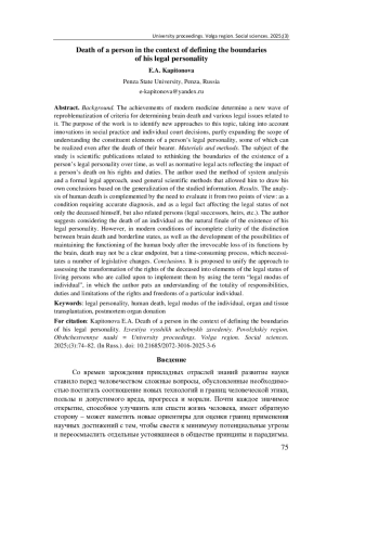 Результаты. Анализ смерти человека комплицируется необходимостью ее оценки с двух точек зрения: как состояния, требующего точной диагностики, и как юридического факта, влияющего на правовой статус не только самого умершего, но и связанных с ним лиц (правопреемников, наследников и др.). Автор предлагает считать смерть индивида закономерным финалом существования его правосубъектности. Однако в современных условиях неполной ясности разграничения смерти мозга и пограничных состояний, а также развития возможностей поддержания функционирования организма человека уже после констатации бесповоротной утраты мозгом своих функций смерть может представлять собой не ясную конечную точку, а растянутый во времени процесс, что обуславливает необходимость внесения ряда изменений в законодательство.