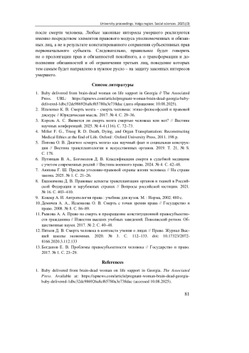 3. Король А. С. Является ли смерть мозга смертью человека или нет? // Вестник научных конференций. 2025. № 4-4 (116). С. 72-73. EDN: WXLDIG