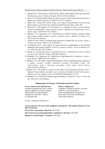 2. Ильченко К. В. Смерть мозга - смерть человека: этико-философский и правовой дискурс // Юридическая мысль. 2017. № 4. С. 29-36. EDN: ZUGGOX