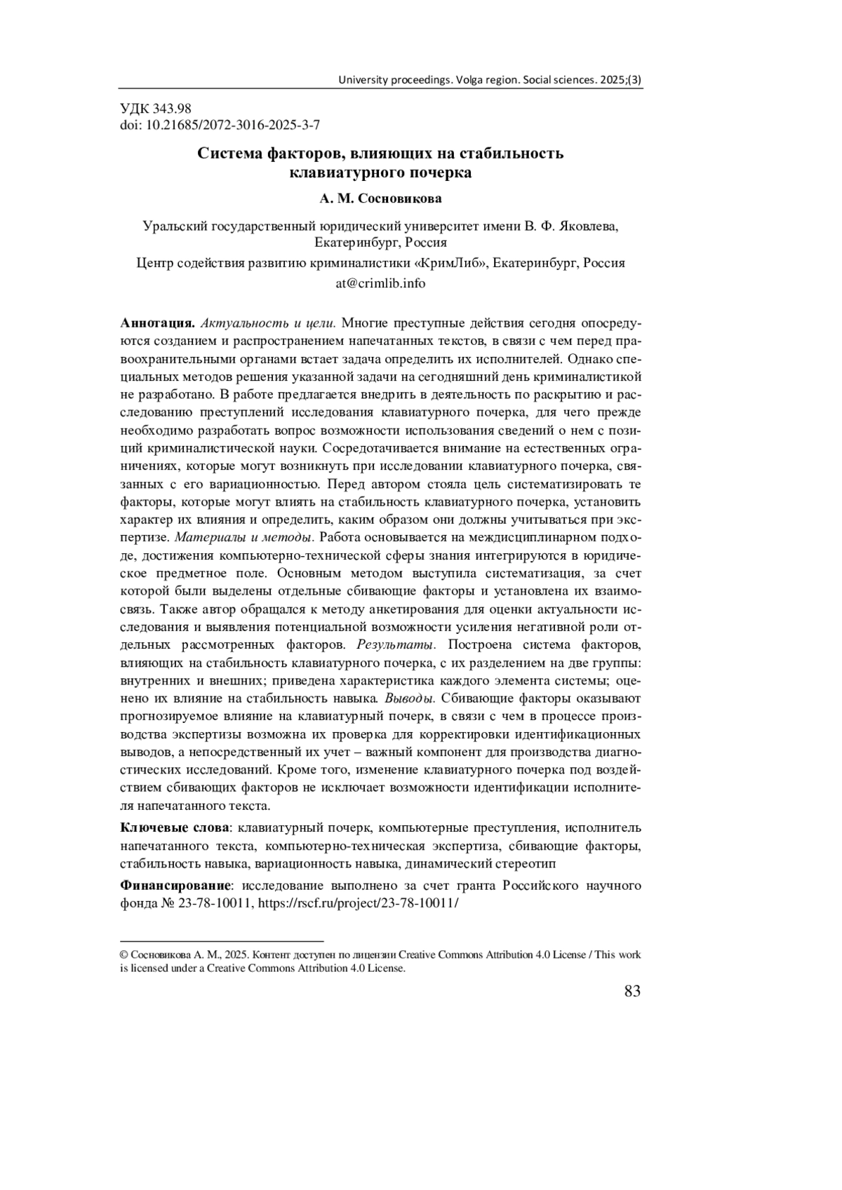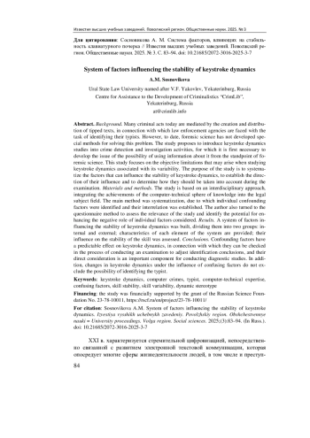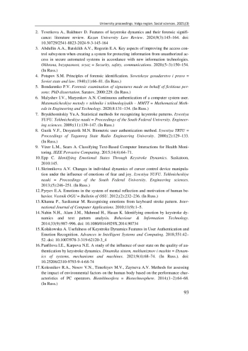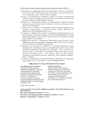 2. Tsvetkova A., Bakhteev D. Features of keystroke dynamics and their forensic significance: literature review // Kazan University Law Review. 2024. Vol. 9, № 3. P. 145-164. DOI: 10.30729/2541-8823-2024-9-3-145-164 EDN: HFLLIV