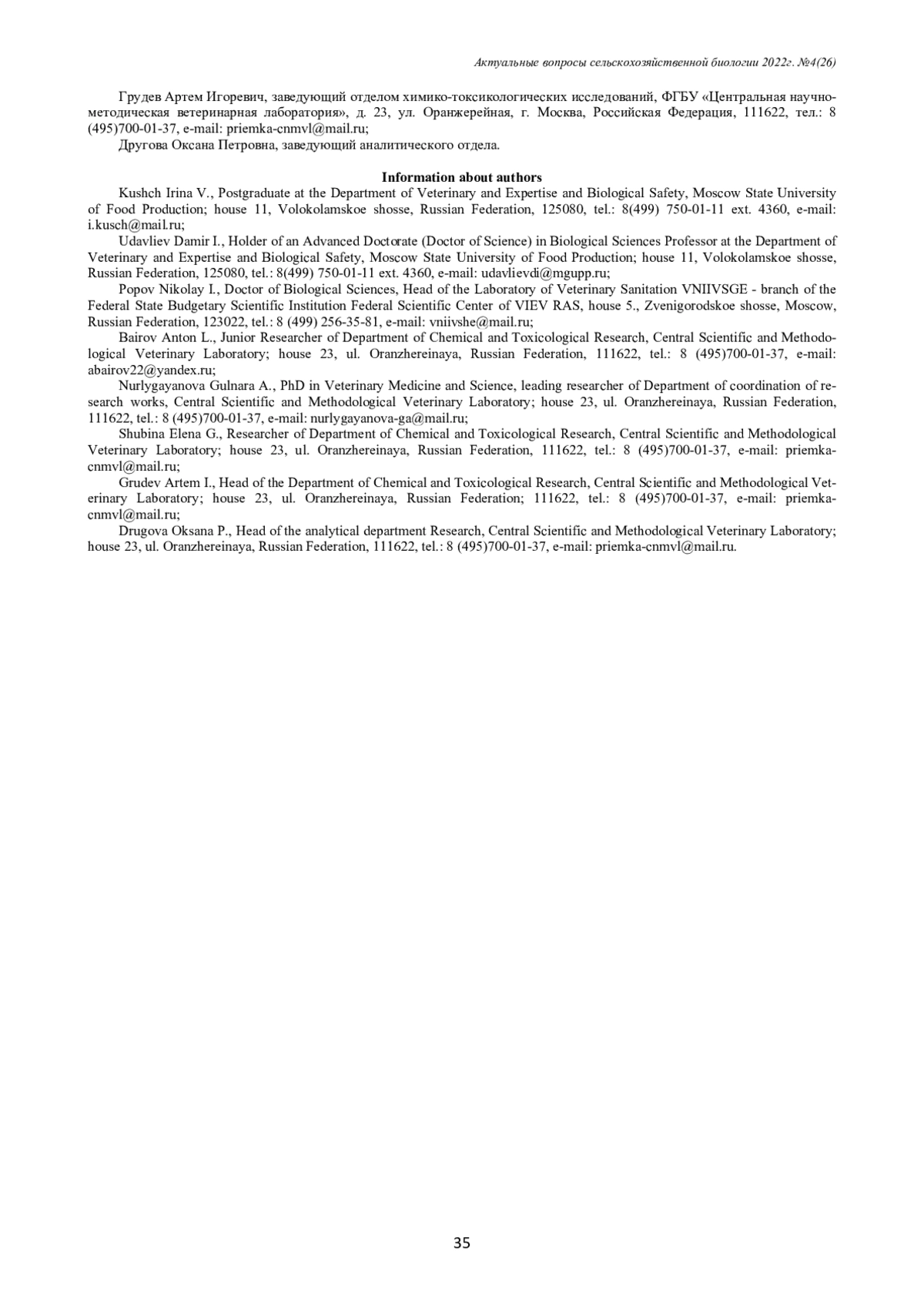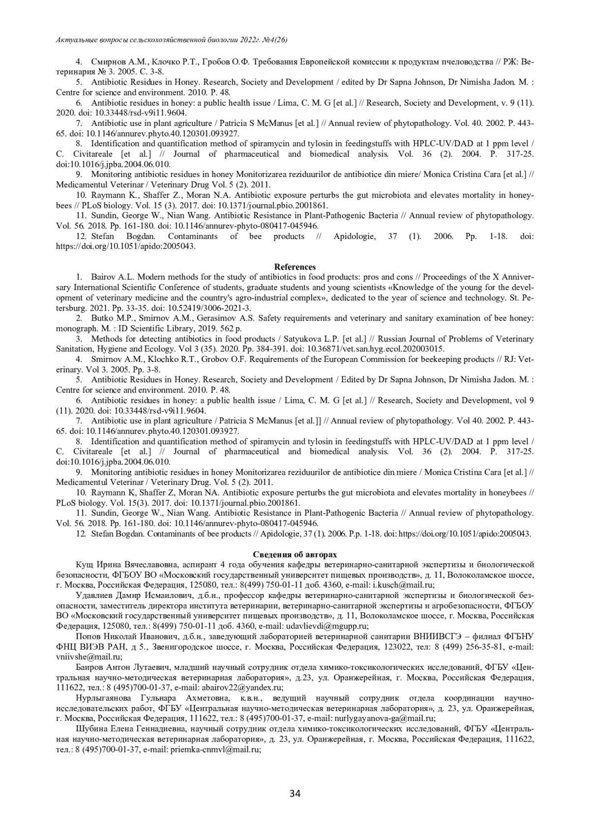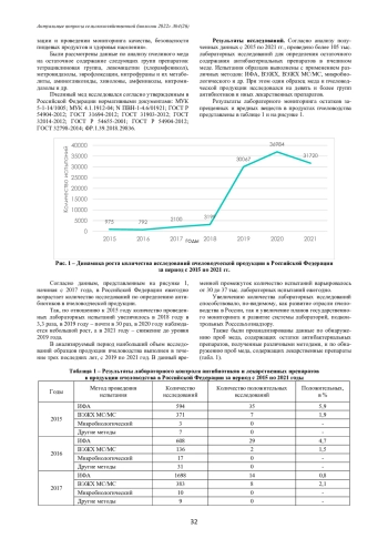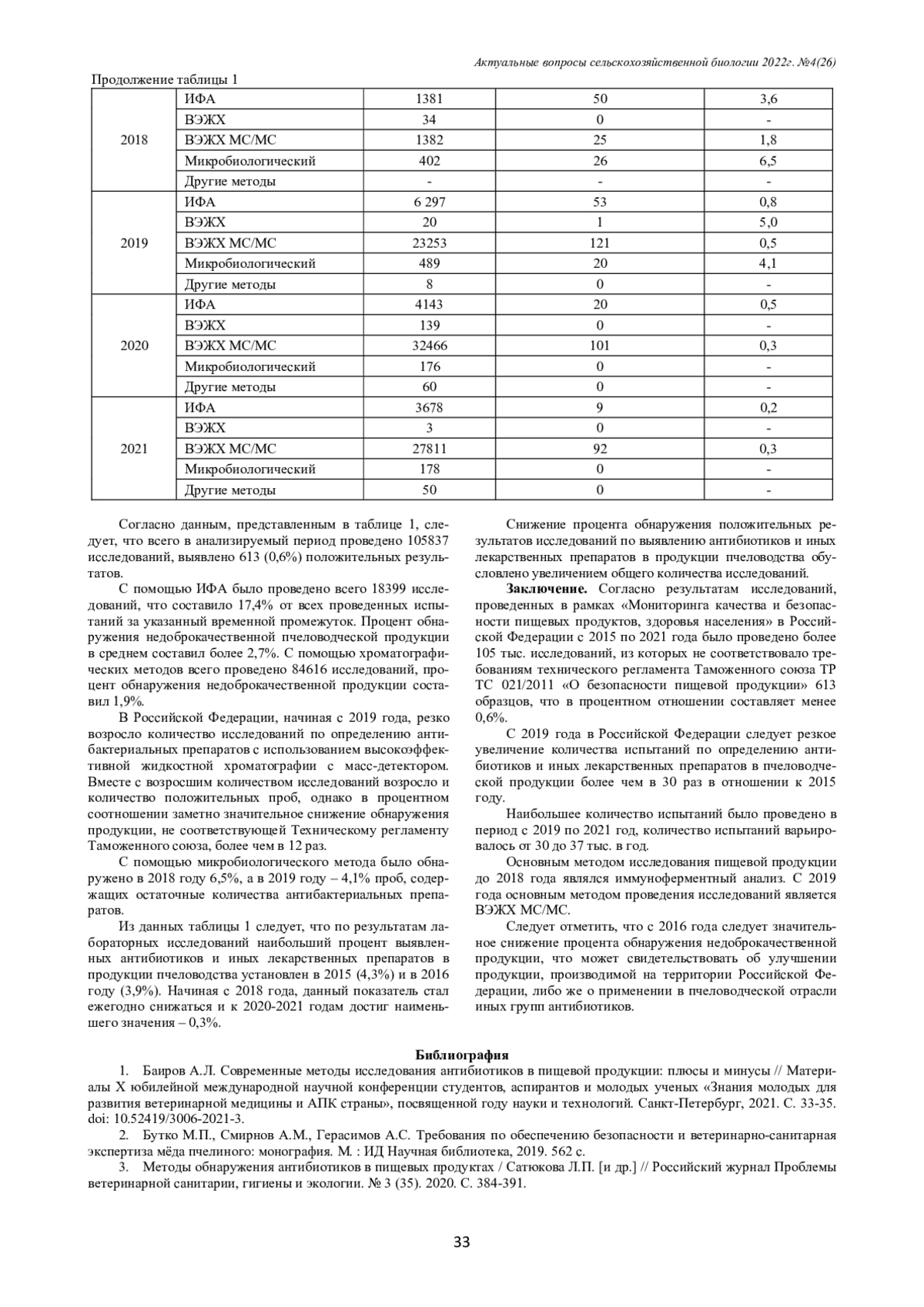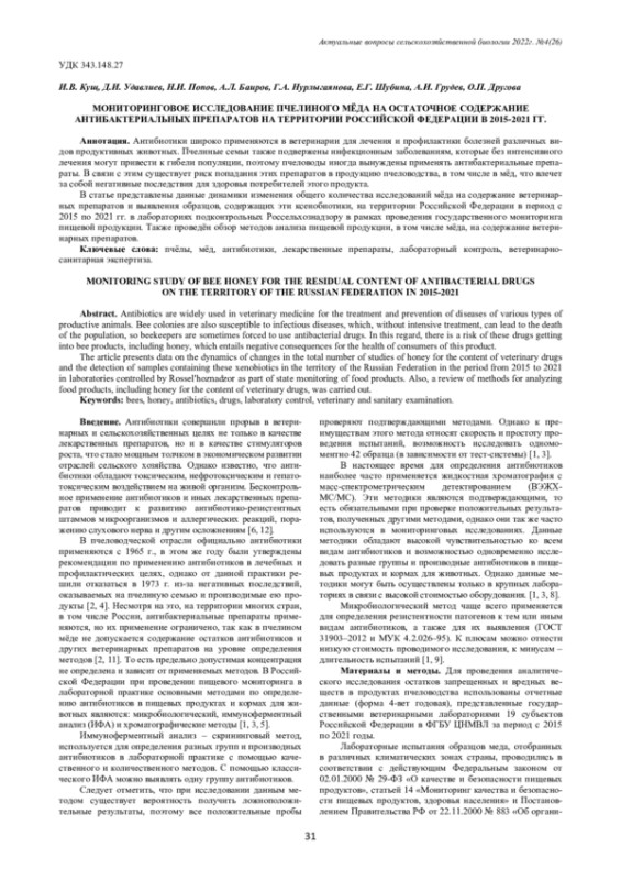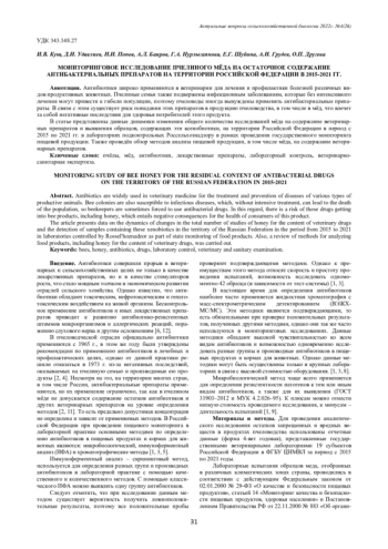 Антибиотики широко применяются в ветеринарии для лечения и профилактики болезней различных видов продуктивных животных. Пчелиные семьи также подвержены инфекционным заболеваниям, которые без интенсивного лечения могут привести к гибели популяции, поэтому пчеловоды иногда вынуждены применять антибактериальные препараты. В связи с этим существует риск попадания этих препаратов в продукцию пчеловодства, в том числе в мёд, что влечет за собой негативные последствия для здоровья потребителей этого продукта. В статье представлены данные динамики изменения общего количества исследований мёда на содержание ветеринарных препаратов и выявления образцов, содержащих эти ксенобиотики, на территории Российской Федерации в период с 2015 по 2021 гг. в лабораториях подконтрольных Россельхознадзору в рамках проведения государственного мониторинга пищевой продукции. Также проведён обзор методов анализа пищевой продукции, в том числе мёда, на содержание ветеринарных препаратов.