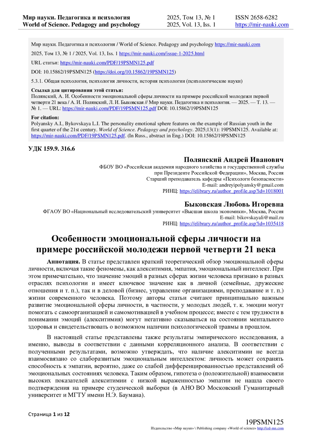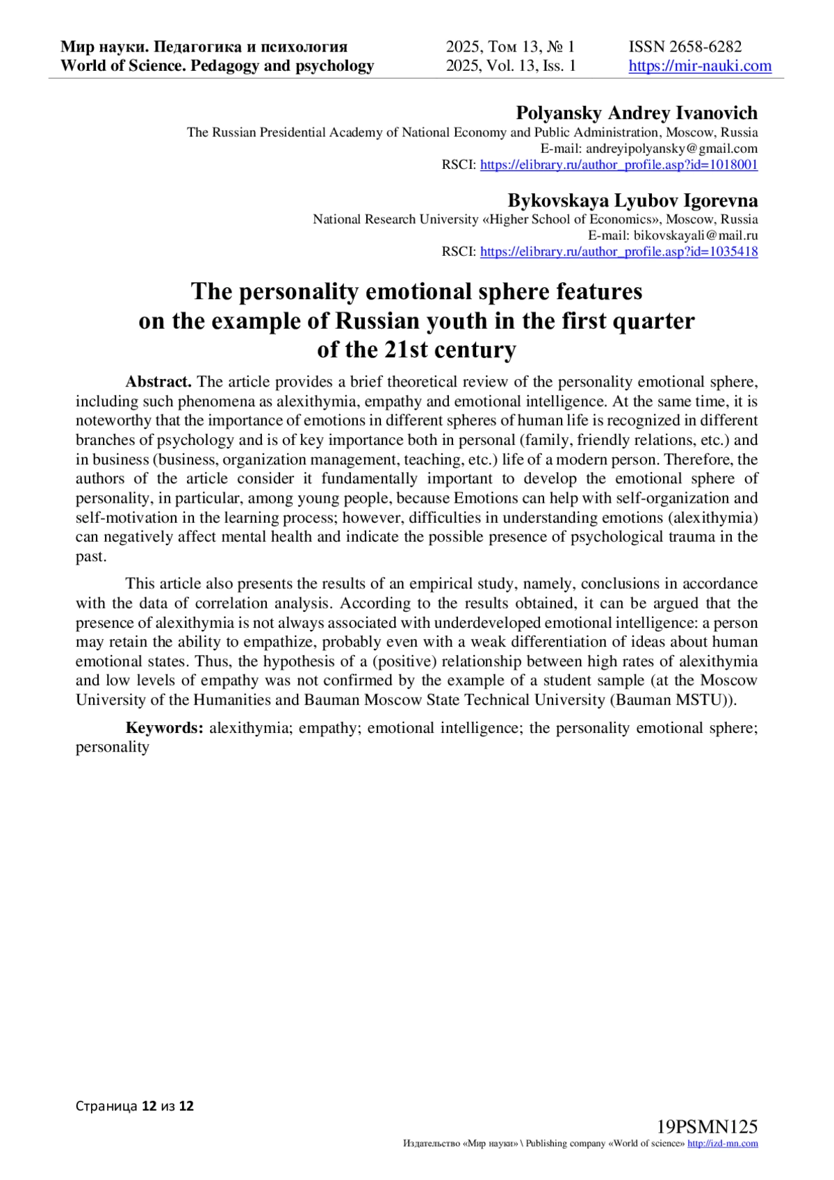 В статье представлен краткий теоретический обзор эмоциональной сферы личности, включая такие феномены, как алекситимия, эмпатия, эмоциональный интеллект. При этом примечательно, что значение эмоций в разных сферах жизни человека признано в разных отраслях психологии и имеет ключевое значение как в личной (семейные, дружеские отношения и т. п.), так и в деловой (бизнес, управление организациями, преподавание и т. п.) жизни современного человека. Поэтому авторы статьи считают принципиально важным развитие эмоциональной сферы личности, в частности, у молодых людей, т. к. эмоции могут помогать с самоорганизацией и самомотивацией в учебном процессе; вместе с тем трудности в понимании эмоций (алекситимия) могут негативно сказываться на состоянии ментального здоровья и свидетельствовать о возможном наличии психологической травмы в прошлом. В настоящей статье представлены также результаты эмпирического исследования, а именно, выводы в соответствии с данными корреляционного анализа. В соответствии с полученными результатами, возможно утверждать, что наличие алекситимии не всегда взаимосвязано со слаборазвитым эмоциональным интеллектом: личность может сохранять способность к эмпатии, вероятно, даже со слабой дифференцированностью представлений об эмоциональных состояниях человека. Таким образом, гипотеза о (положительной) взаимосвязи высоких показателей алекситимии с низкой выраженностью эмпатии не нашла своего подтверждения на примере студенческой выборки (в АНО ВО Московский Гуманитарный университет и МГТУ имени Н. Э. Баумана).