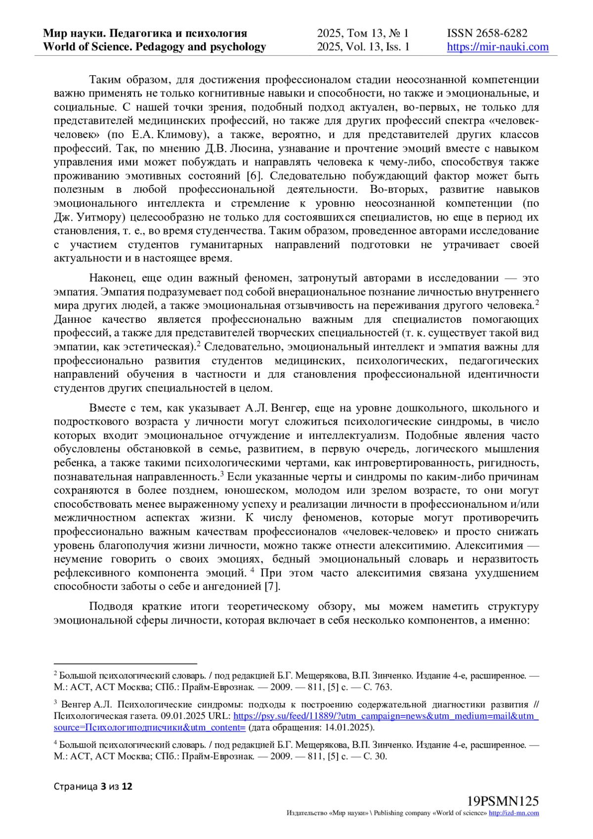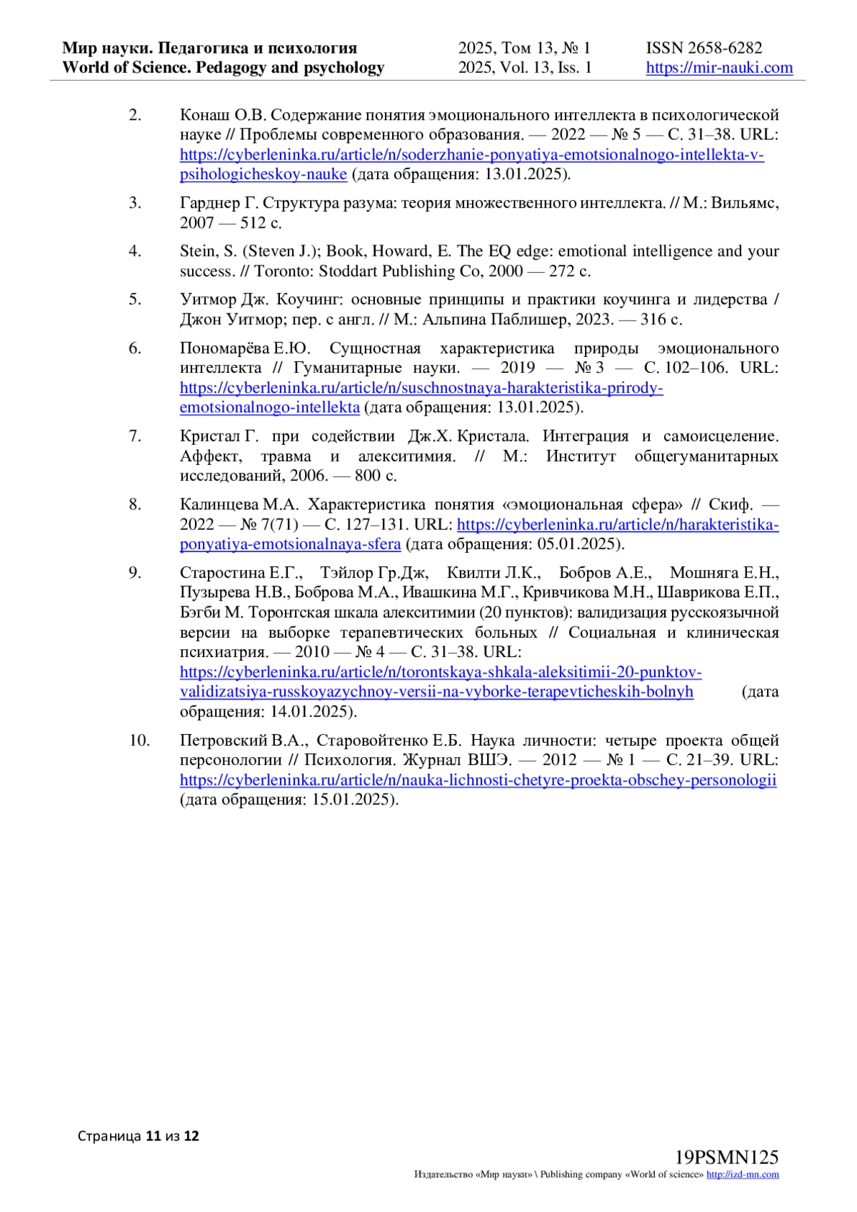 2. Конаш О.В. Содержание понятия эмоционального интеллекта в психологической науке // Проблемы современного образования. - 2022 - № 5 - С. 31-38. URL: https://cyberleninka.ru/article/n/soderzhanie-ponyatiya-emotsionalnogo-intellekta-v-psihologicheskoy-nauke (дата обращения: 13.01.2025). EDN: WTTICC
