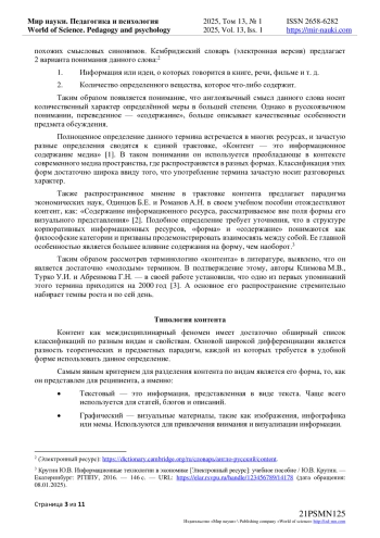 1. Павленко Т.С. Понятие “контент”: типология, виды и технология получения дидактического контента в образовательном процессе / Т.С. Павленко // Известия Волгоградского государственного педагогического университета. - 2017. - № 10(123). - С. 31-35. - URL: https://cyberleninka.ru/article/n/ponyatie-kontent-tipologiya-vidy-i-tehnologiya-polucheniya-didakticheskogo-kontenta-v-obrazovatelnom-protsesse (дата обращения: 11.01.2025). EDN: ZTHXZZ