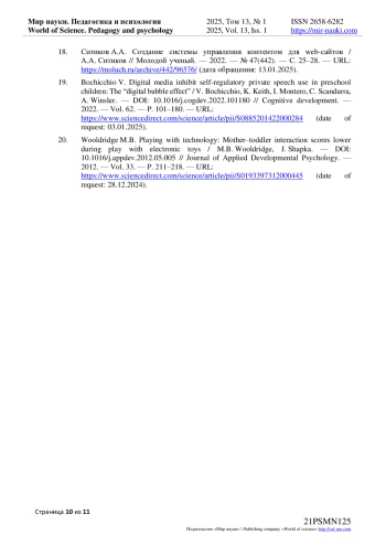 19. Bochicchio V. Digital media inhibit self-regulatory private speech use in preschool children: The “digital bubble effect” / V. Bochicchio, K. Keith, I. Montero, C. Scandurra, A. Winsler. - // Cognitive development. - 2022. - Vol. 62. - P. 101-180. - URL: https://www.sciencedirect.com/science/article/pii/S0885201422000284 (date of request: 03.01.2025). DOI: 10.1016/j.cogdev.2022.101180 EDN: PRPRWE