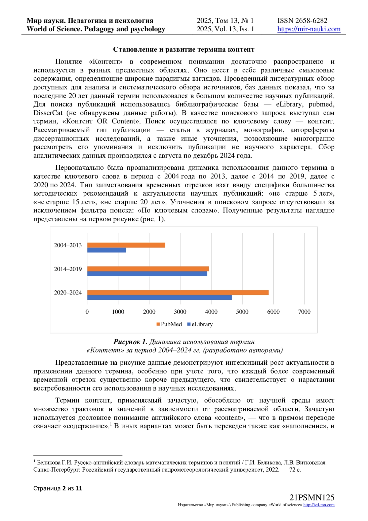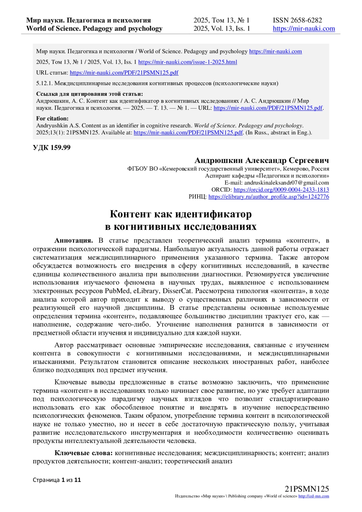 В статье представлен теоретический анализ термина «контент», в отражении психологической парадигмы. Наибольшую актуальность данной работы отражает систематизация междисциплинарного применения указанного термина. Также автором обсуждается возможность его внедрения в сферу когнитивных исследований, в качестве единицы количественного анализа при выполнении диагностики. Резюмируется увеличение использования изучаемого феномена в научных трудах, выявленное с использованием электронных ресурсов PubMed, eLibrary, DisserCat. Рассмотрена типология «контента», в ходе анализа которой автор приходит к выводу о существенных различиях в зависимости от реализующей его научной дисциплины. В статье представлены основные используемые определения термина «контент», подавляющее большинство дисциплин трактует его, как - наполнение, содержание чего-либо. Уточнение наполнения разнится в зависимости от предметной области изучения и индивидуально для каждой науки. Автор рассматривает основные эмпирические исследования, связанные с изучением контента в совокупности с когнитивными исследованиями, и междисциплинарными изысканиями. Результатом становится описание нескольких иностранных работ, наиболее близко подходящих под предмет изучения. Ключевые выводы предложенные в статье возможно заключить, что применение термина «контент» в исследованиях только начинает свое развитие, но уже требует адаптации под психологическую парадигму научных взглядов что позволит стандартизировано использовать его как обособленное понятие и внедрять в изучение непосредственно психологических феноменов. Таким образом, употребление термина контент в психологической науке не только уместно, но и несет в себе достаточную практическую пользу, учитывая развитие исследовательского инструментария и необходимости количественно оценивать продукты интеллектуальной деятельности человека.