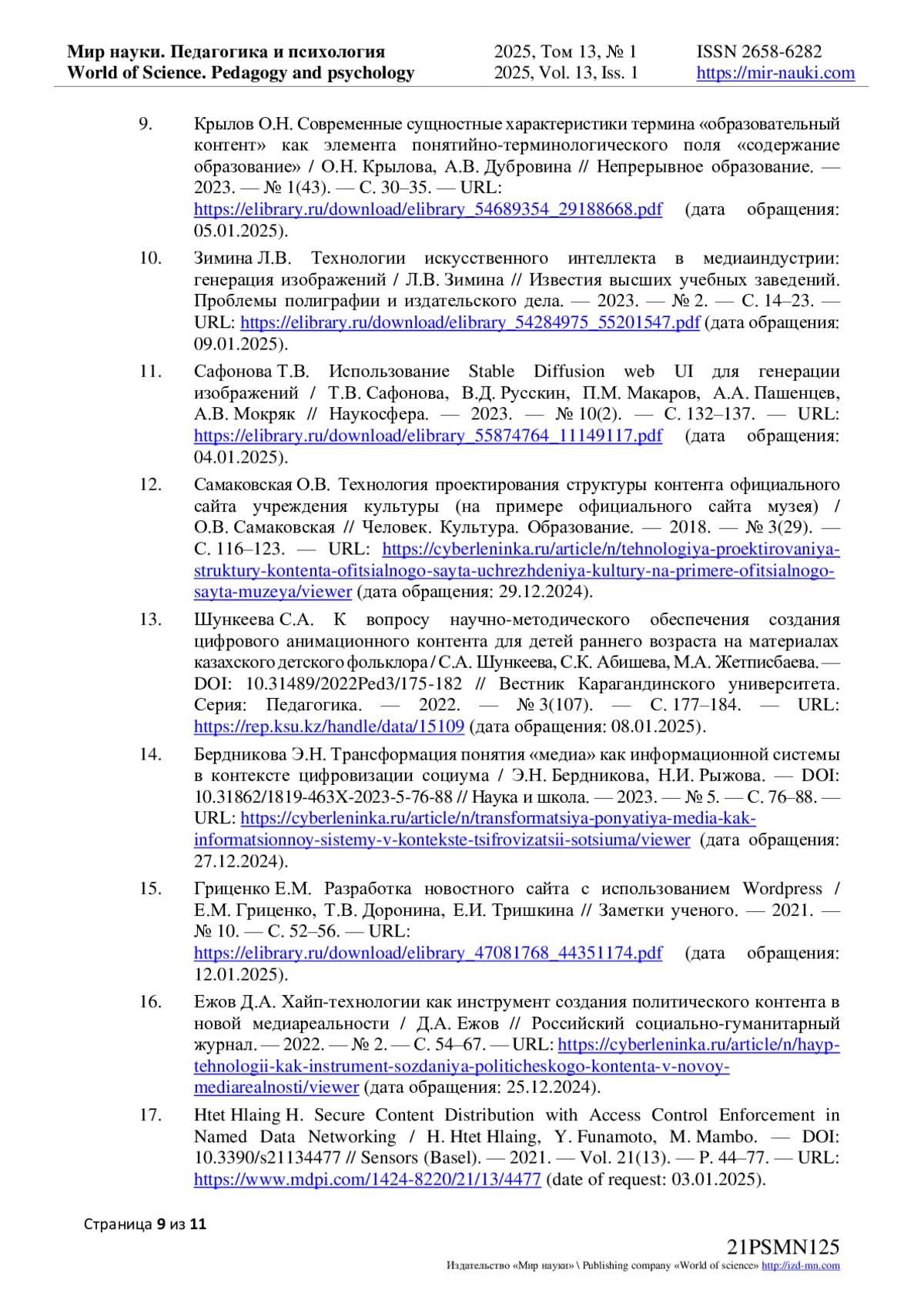 9. Крылов О.Н. Современные сущностные характеристики термина “образовательный контент” как элемента понятийно-терминологического поля “содержание образование” / О.Н. Крылова, А.В. Дубровина // Непрерывное образование. - 2023. - № 1(43). - С. 30-35. - URL: https://elibrary.ru/download/elibrary_54689354_29188668.pdf (дата обращения: 05.01.2025).