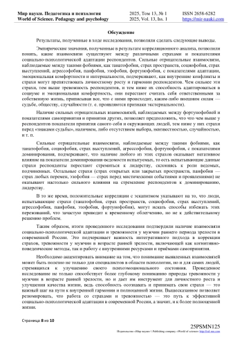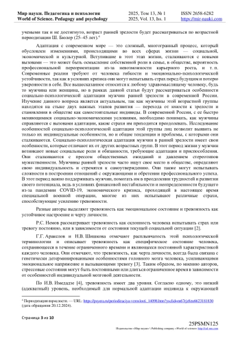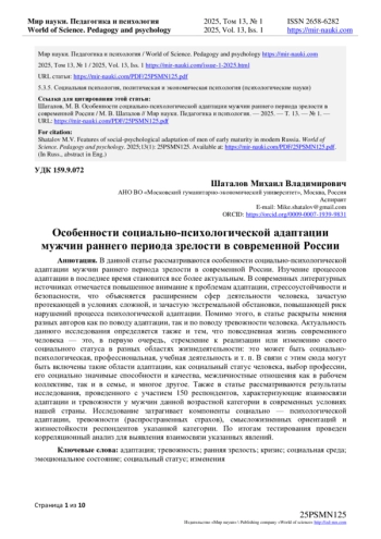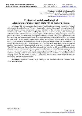 В данной статье рассматриваются особенности социально-психологической адаптации мужчин раннего периода зрелости в современной России. Изучение процессов адаптации в последнее время становится все более актуальным. В современных литературных источниках отмечается повышенное внимание к проблемам адаптации, стрессоустойчивости и безопасности, что объясняется расширением сфер деятельности человека, зачастую протекающей в условиях сложной, и зачастую экстремальной обстановки, повышающей риск нарушений процесса психологической адаптации. Помимо этого, в статье раскрыты мнения разных авторов как по поводу адаптации, так и по поводу тревожности человека. Актуальность данного исследования определяется также и тем, что повседневная жизнь современного человека - это, в первую очередь, стремление к реализации или изменению своего социального статуса в разных областях жизнедеятельности: это может быть социально-психологическая, профессиональная, учебная деятельность и т. п. В связи с этим сюда могут быть включены такие области адаптации, как социальный статус человека, выбор профессии, его социально значимые способности и качества, межличностные отношения как в рабочем коллективе, так и в семье, и многое другое. Также в статье рассматриваются результаты исследования, проведенного с участием 150 респондентов, характеризующие взаимосвязи адаптации и тревожности у мужчин данной возрастной категории в современных условиях нашей страны. Исследование затрагивает компоненты социально - психологической адаптации, тревожности (распространенных страхов), смысложизненных ориентаций и жизнестойкости респондентов указанной категории. По итогам тестирования проведен корреляционный анализ для выявления взаимосвязи указанных явлений.