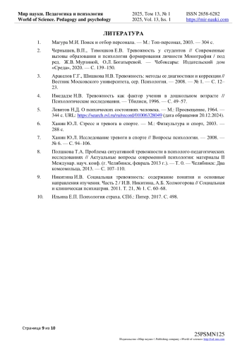 9. Никитина И.В. Социальная тревожность: содержание понятия и основные направления изучения. Часть 2 / И.В. Никитина, А.Б. Холмогорова // Социальная и клиническая психиатрия. 2011. Т. 21, № 1. С. 60-68. EDN: OXYZPD