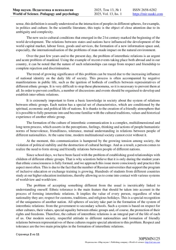 The culture of interethnic relations is an organic component of the spiritual life of society and its culture. This is a set of special personality qualities, skills and knowledge, manners of behavior, the commission of certain actions that manifest themselves in the interaction of representatives of various ethnic communities and which allow us to achieve mutual understanding in many aspects.
