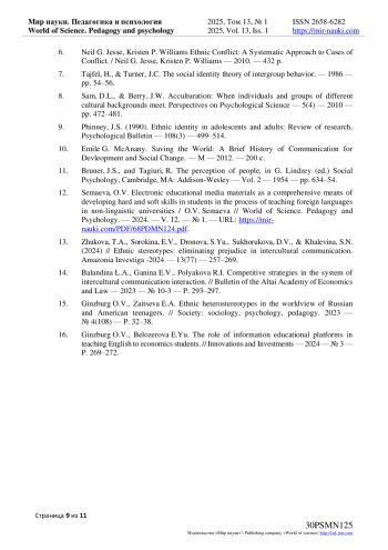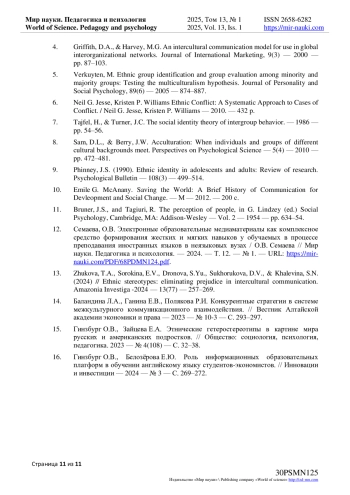 15. Гинзбург О.В., Зайцева Е.А. Этнические гетеростереотипы в картине мира русских и американских подростков. // Общество: социология, психология, педагогика. 2023 - № 4(108) - С. 32-38. EDN: ECXSAM