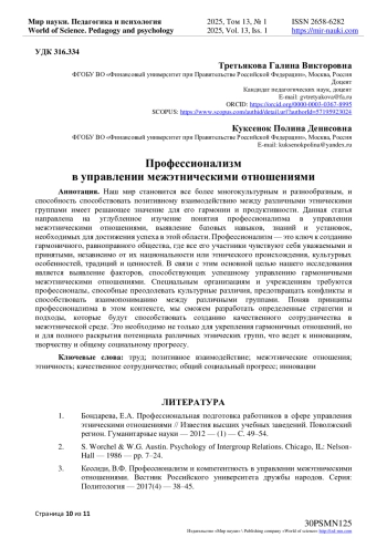 Наш мир становится все более многокультурным и разнообразным, и способность ориентироваться и способствовать позитивному взаимодействию между различными этническими группами имеет решающее значение для его поддержания, его гармонии и продуктивности. Данная статья направлена на углубленное изучение понятия профессионализма в управлении межэтническими отношениями, выявление базовых навыков, знаний и установок, необходимых для достижения успеха в этой области. Профессионализм - это ключ к созданию гармоничного, равноправного и понимающего общества, где все его участники чувствуют себя уважаемыми и принятыми, независимо от их национальности или этнического происхождения, культурных особенностей, традиций и ценностей. В связи с этим основной целью нашего исследования является выявление факторов, способствующих успешному управлению гармоничными межэтническими отношениями. Специальным организациям и учреждениям требуются профессионалы в этой области, способные преодолевать культурные различия, предотвращать конфликты и способствовать взаимопониманию между различными группами. Поняв принципы профессионализма в этом контексте, мы сможем разработать определенные стратегии и подходы, которые будут способствовать созданию качественного сотрудничества в межэтнической среде. Это необходимо не только для укрепления гармоничных отношений, но и для полного раскрытия потенциала различных этнических групп, что ведет к инновациям, творчеству и общему социальному прогрессу.