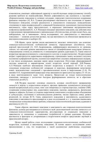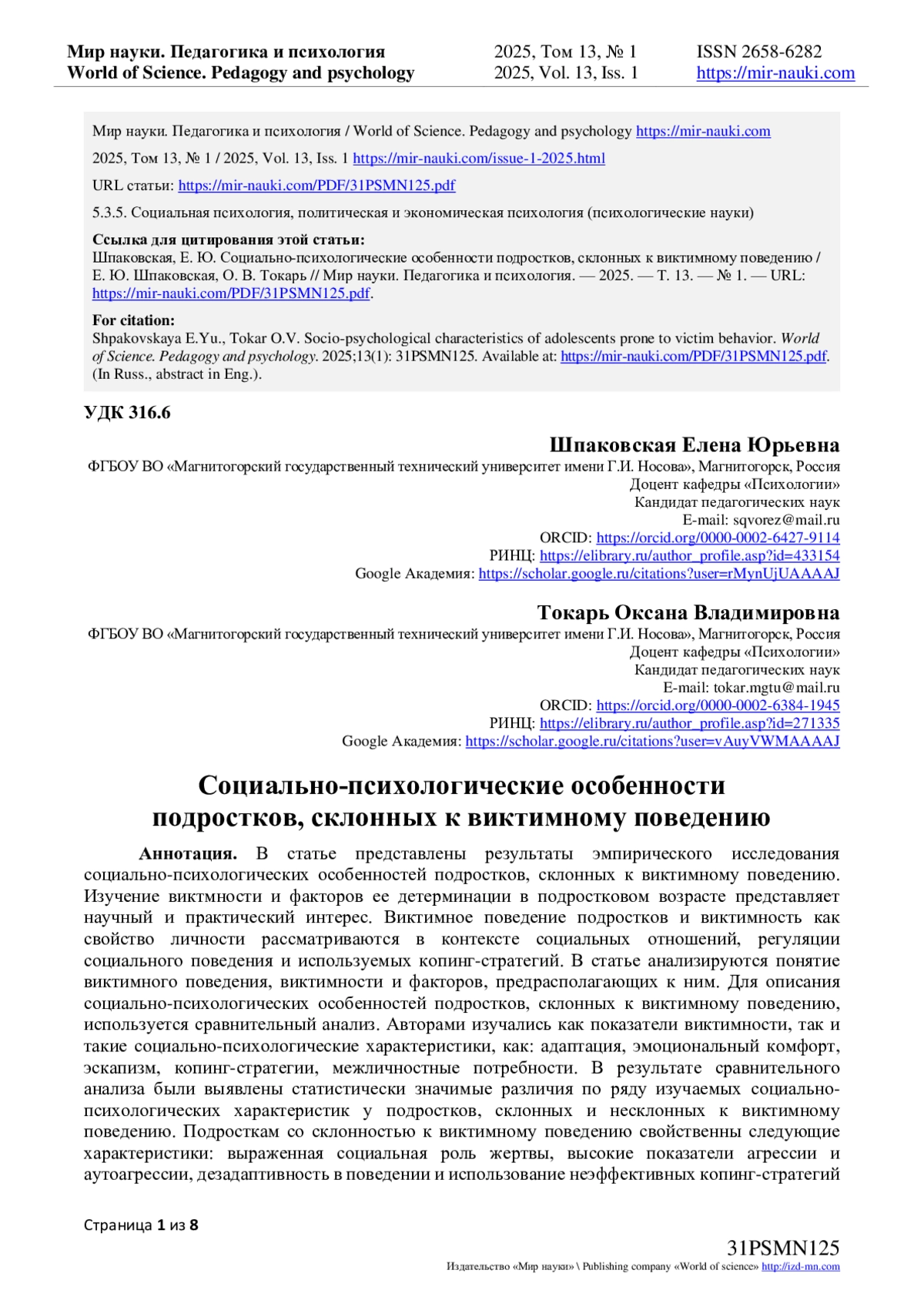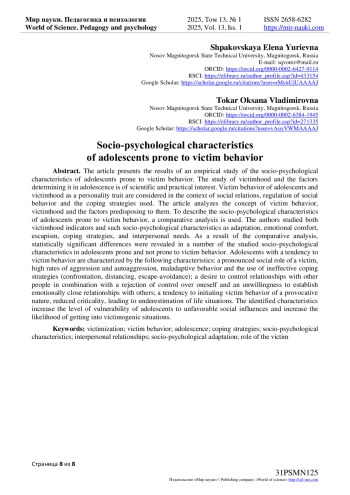 В статье представлены результаты эмпирического исследования социально-психологических особенностей подростков, склонных к виктимному поведению. Изучение виктмности и факторов ее детерминации в подростковом возрасте представляет научный и практический интерес. Виктимное поведение подростков и виктимность как свойство личности рассматриваются в контексте социальных отношений, регуляции социального поведения и используемых копинг-стратегий. В статье анализируются понятие виктимного поведения, виктимности и факторов, предрасполагающих к ним. Для описания социально-психологических особенностей подростков, склонных к виктимному поведению, используется сравнительный анализ. Авторами изучались как показатели виктимности, так и такие социально-психологические характеристики, как: адаптация, эмоциональный комфорт, эскапизм, копинг-стратегии, межличностные потребности. В результате сравнительного анализа были выявлены статистически значимые различия по ряду изучаемых социально-психологических характеристик у подростков, склонных и несклонных к виктимному поведению. Подросткам со склонностью к виктимному поведению свойственны следующие характеристики: выраженная социальная роль жертвы, высокие показатели агрессии и аутоагрессии, дезадаптивность в поведении и использование неэффективных копинг-стратегий (конфронтация, дистанцирование, бегство-избегание); стремление контролировать отношения с другими людьми в сочетании с неприятием контроля над собой и нежелание устанавливать эмоционально близкие отношения с другими; склонность к инициирующему виктимному поведению, носящему провокативный характер, сниженная критичность, приводящая к недооценке жизненных ситуаций. Выявленные особенности повышают уровень уязвимости подростков к неблагоприятным социальным влияниям и усиливают вероятность попадания в виктимогенные ситуации.