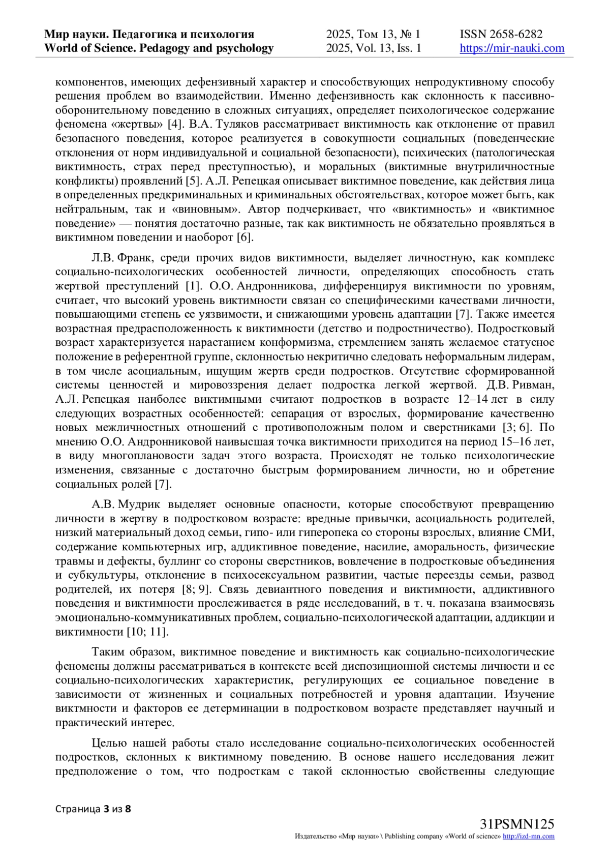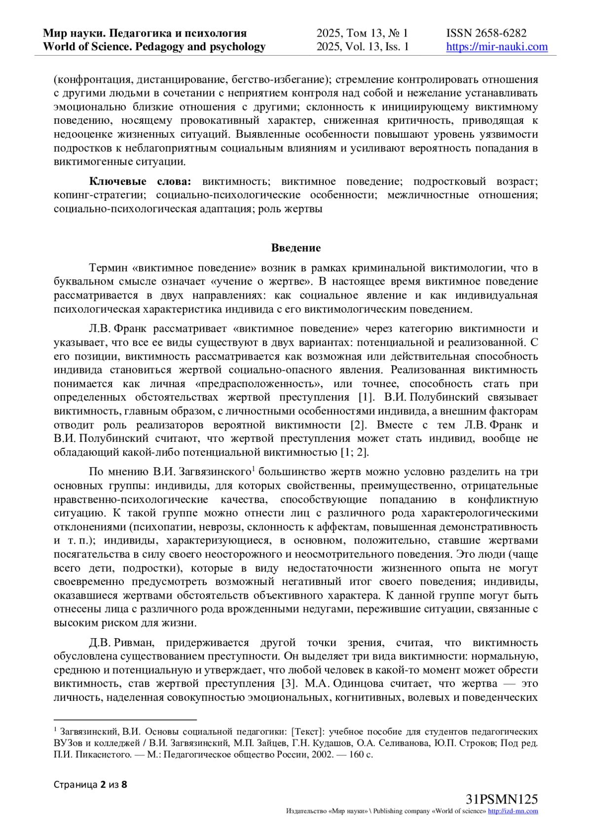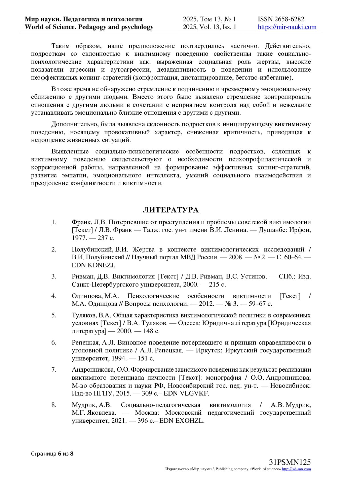4. Одинцова, М.А. Психологические особенности виктимности [Текст] / М.А. Одинцова // Вопросы психологии. - 2012. - № 3. - 59-67 c. EDN: PXTBNN