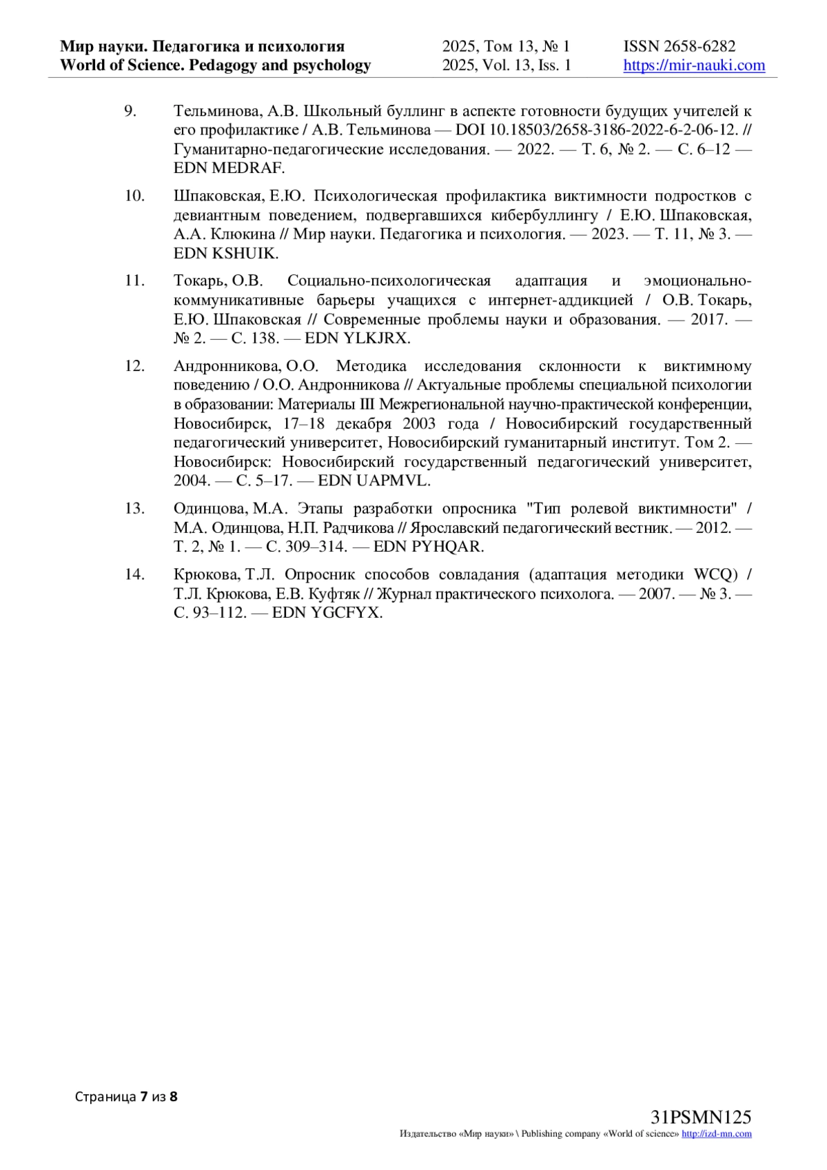 13. Одинцова, М.А. Этапы разработки опросника “Тип ролевой виктимности” / М.А. Одинцова, Н.П. Радчикова // Ярославский педагогический вестник. - 2012. - Т. 2, № 1. - С. 309-314. EDN: PYHQAR