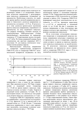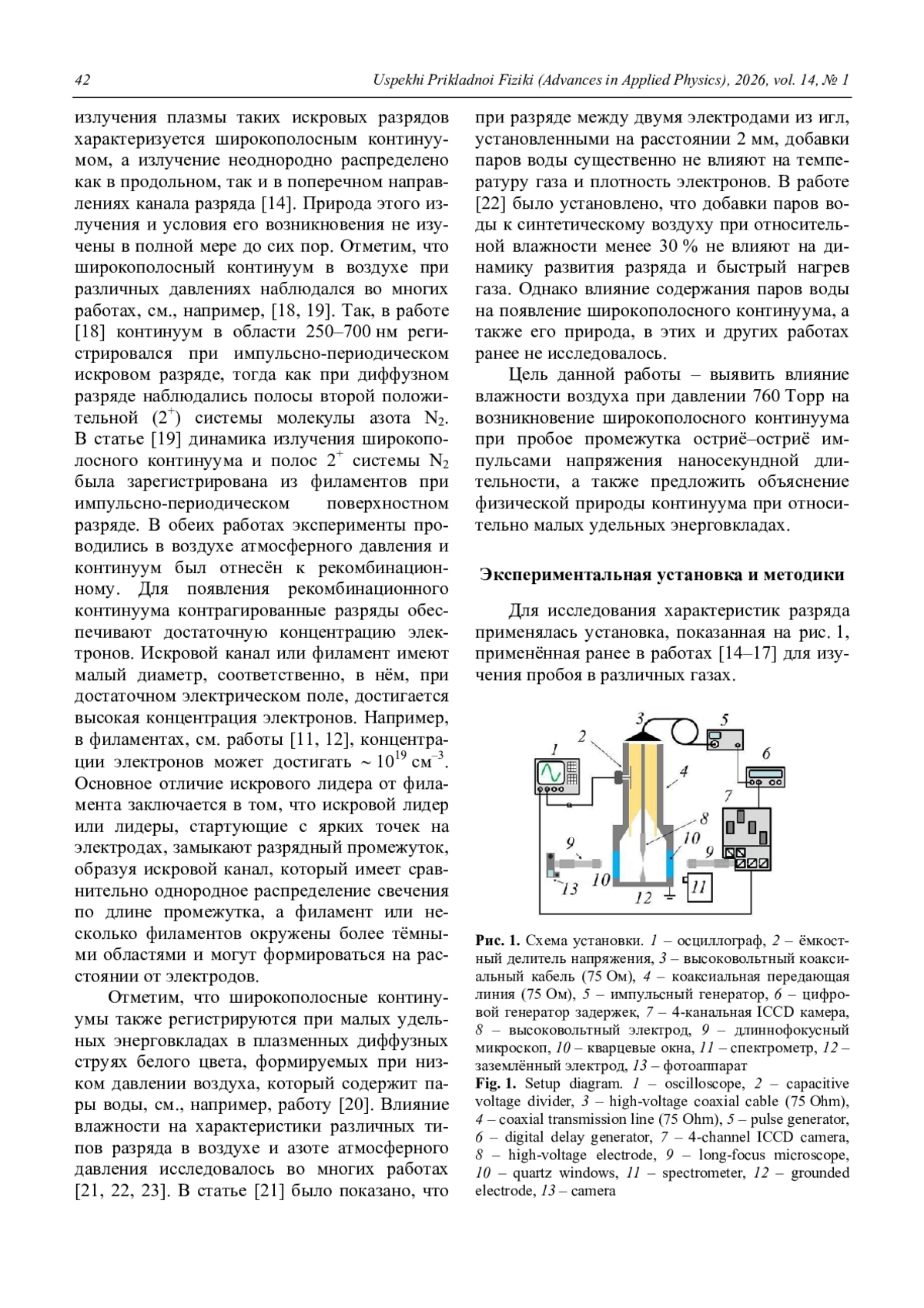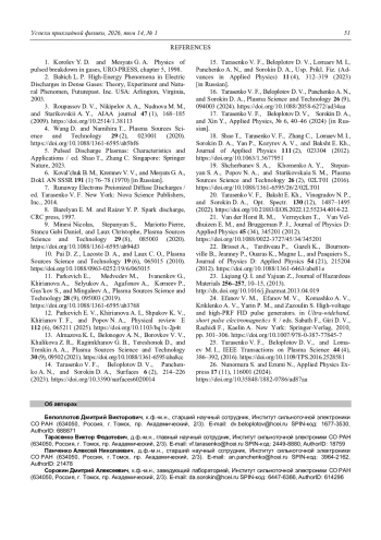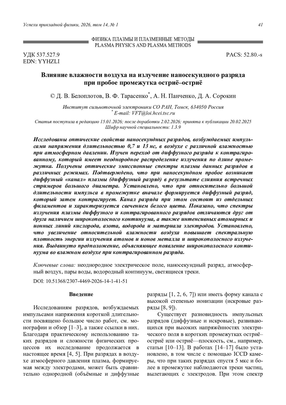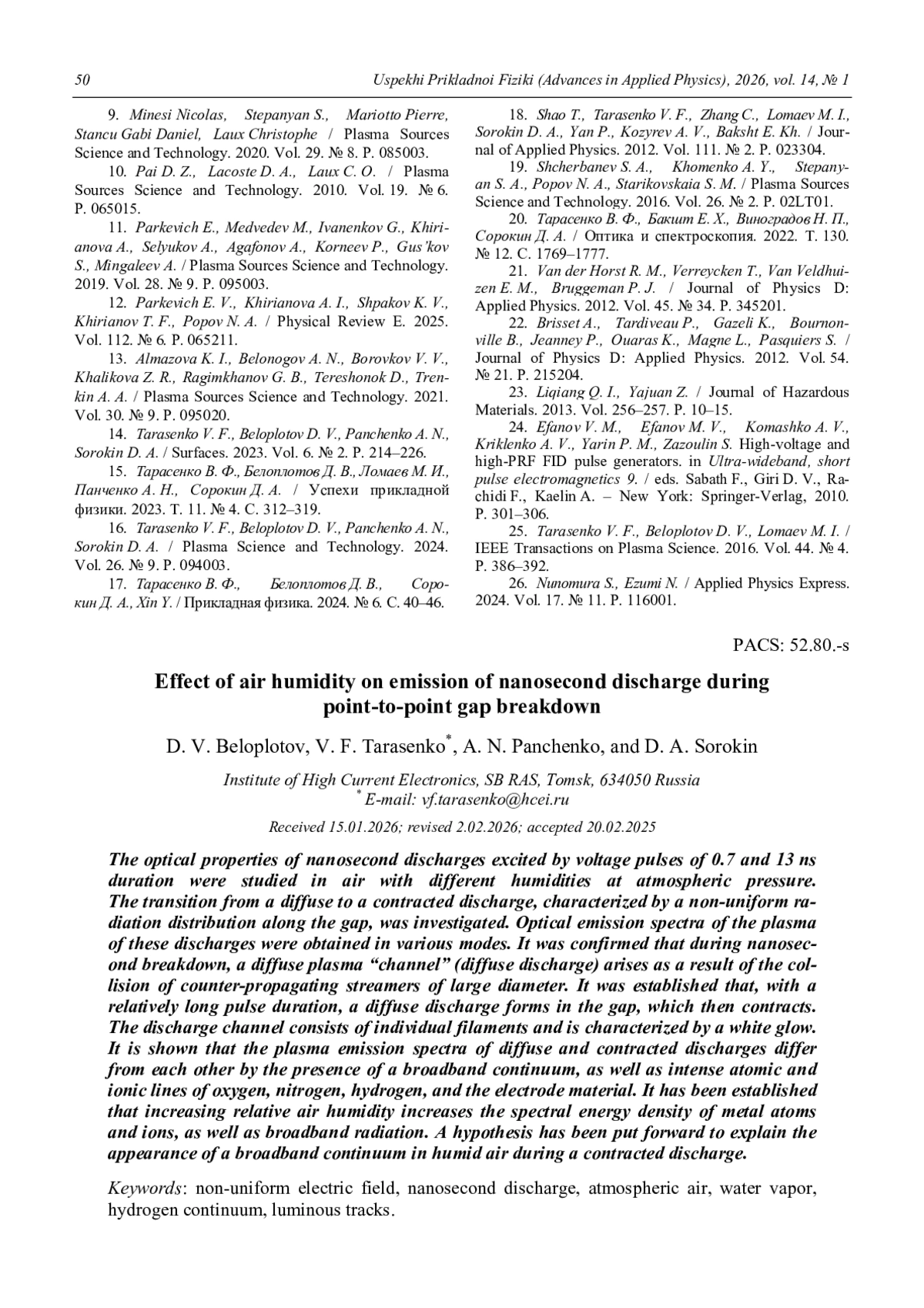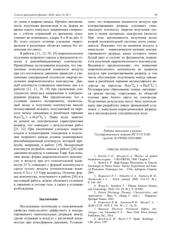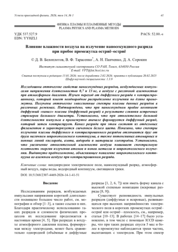 Исследованы оптические свойства наносекундных разрядов, возбуждаемых импульсами напряжения длительностью 0,7 и 13 нс, в воздухе с различной влажностью при атмосферном давлении. Изучен переход от диффузного разряда к контрагированному, который имеет неоднородное распределение излучения по длине промежутка. Получены оптические эмиссионные спектры плазмы данных разрядов в различных режимах. Подтверждено, что при наносекундном пробое возникает диффузный «канал» плазмы (диффузный разряд) в результате слияния встречных стримеров большого диаметра. Установлено, что при относительно большой длительности импульса в промежутке вначале формируется диффузный разряд, который затем контрагирует. Канал разряда при этом состоит из отдельных филаментов и характеризуется свечением белого цвета. Показано, что спектры излучения плазмы диффузного и контрагированного разрядов отличаются друг от друга наличием широкополосного континуума, а также интенсивных атомарных и ионных линий кислорода, азота, водорода и материала электродов. Установлено, что увеличение относительной влажности воздуха повышает спектральную плотность энергии излучения атомов и ионов металла и широкополосного излучения. Выдвинуто предположение, объясняющее появление широкополосного континуума во влажном воздухе при контрагированном разряда.